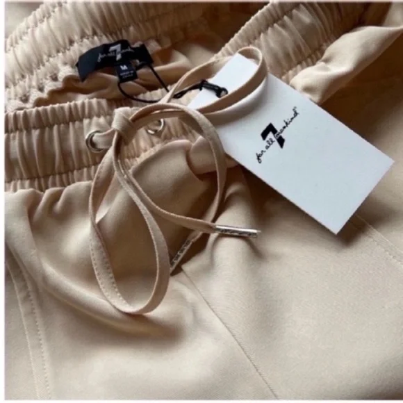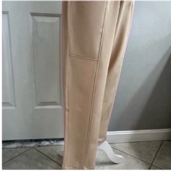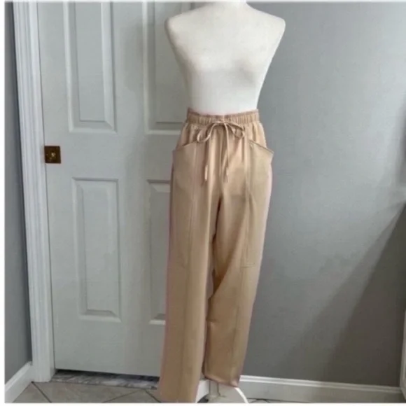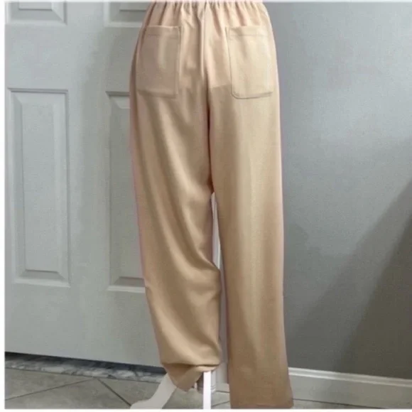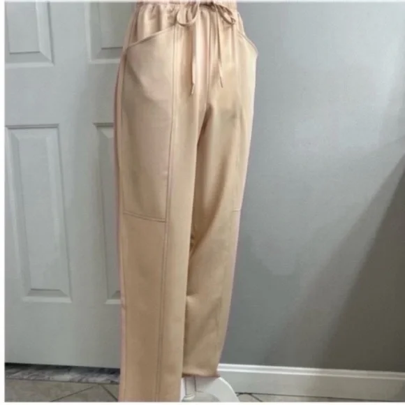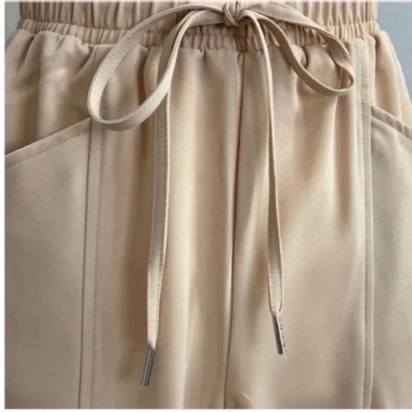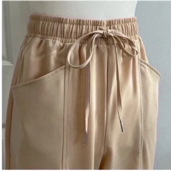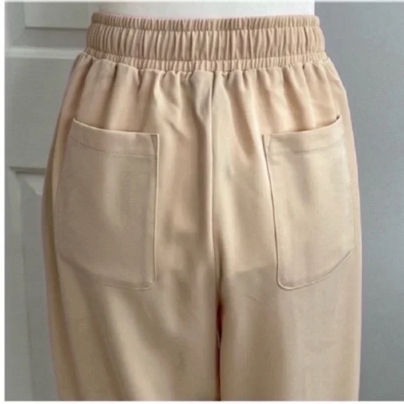 These light beige joggers offer a relaxed fit with a comfortable elastic waistband and drawstring for an adjustable fit. Made from a sott, lightweight fabric, they provide a versatile and casual style perfect for everyday wear. The straight leg design adds a touch of modern simplicity to your wardrobe.Suiting cargo pant.Elastic waist with silver grommets.Drawstring with silver tip.Stitching detail at legs.Two front and two back pockets.Material: 95% polyester, 5% spandex.Measurements:Waist (side to side) 14"Inseam 29"