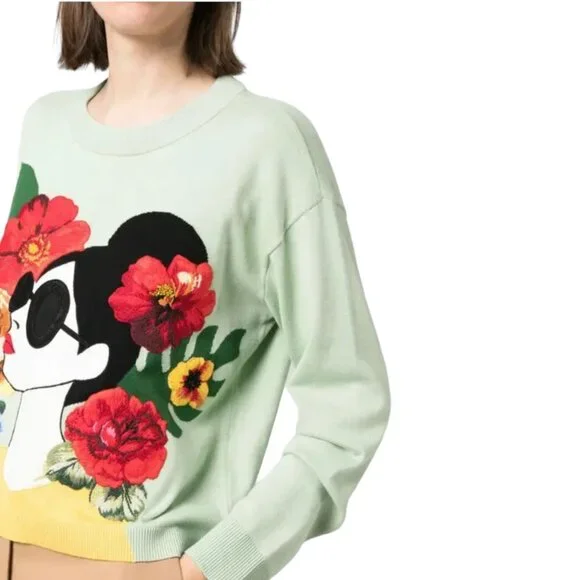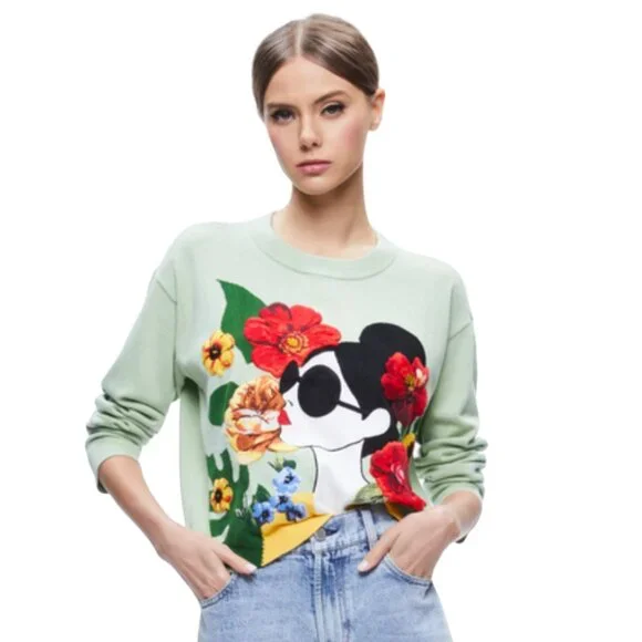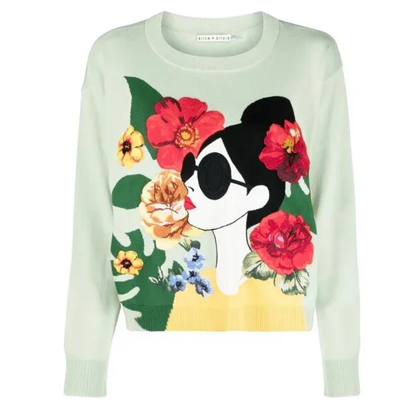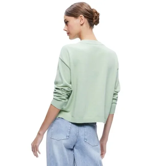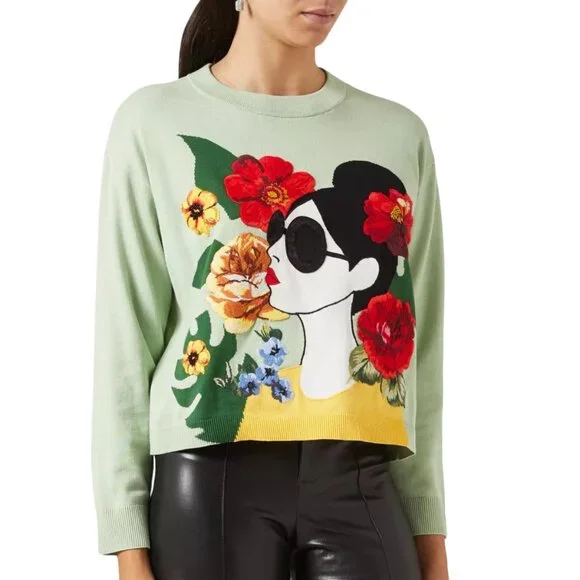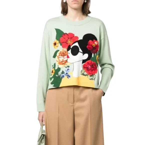 This perfect pullover includes a slightly relaxed fit, ribbing at the cuffs and waist and a bit of a cropped silhouette. So good with denim, skirts and everything else you may pair with it.PulloverLong sleeveCrewneckRibbed trimStace face motifTotal length: 21 1/2”100% cottonFits true to sizeDry clean onlyImportedNew without tag, retail $500 plus tax