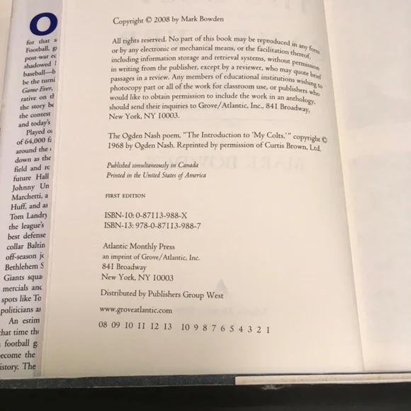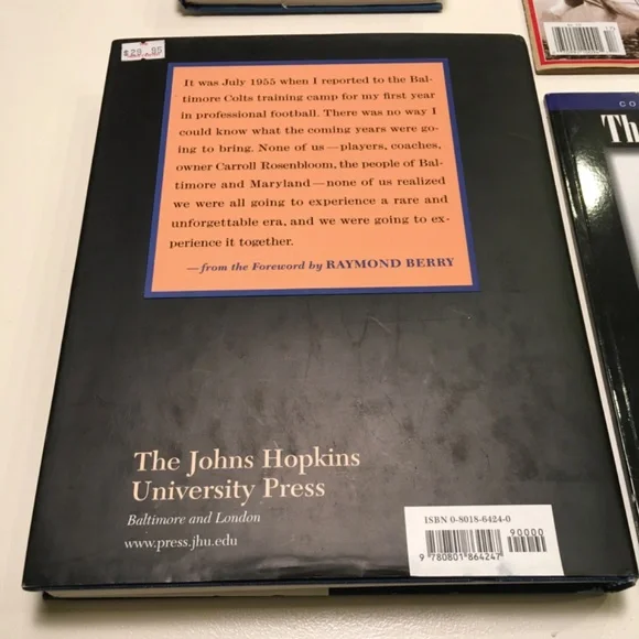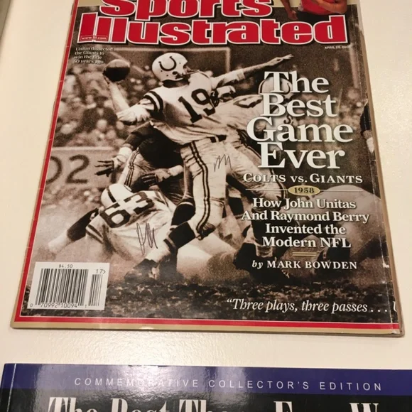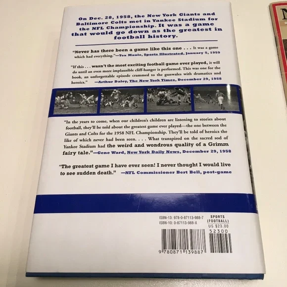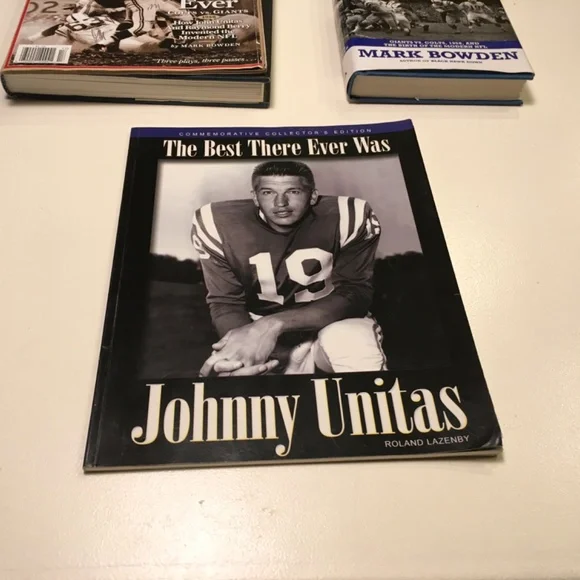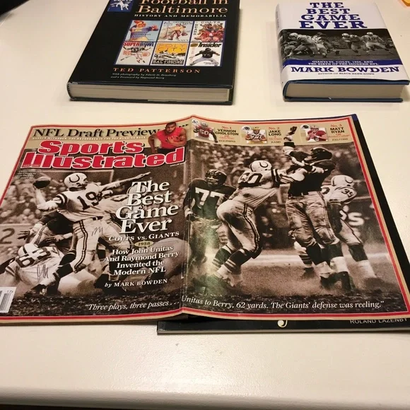 Bundle includes hardcover books with dust jackets “The Best Game Ever” and “Football in Baltimore”, softcover commemorative collector’s edition “The Best There Ever Was/Johnny Unitas” and April 28, 2008, copy of Sports Illustrated magazine “The Best Game Ever”. All are in excellent to very good used condition with minimal wear.Cannot be bundled with other items due to shipping weight restrictions.New to ? Create an account using referral code CrickettsCache and receive a $10 credit towards your firstpurchase! Signing up is free!