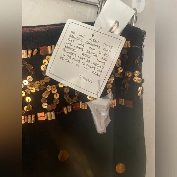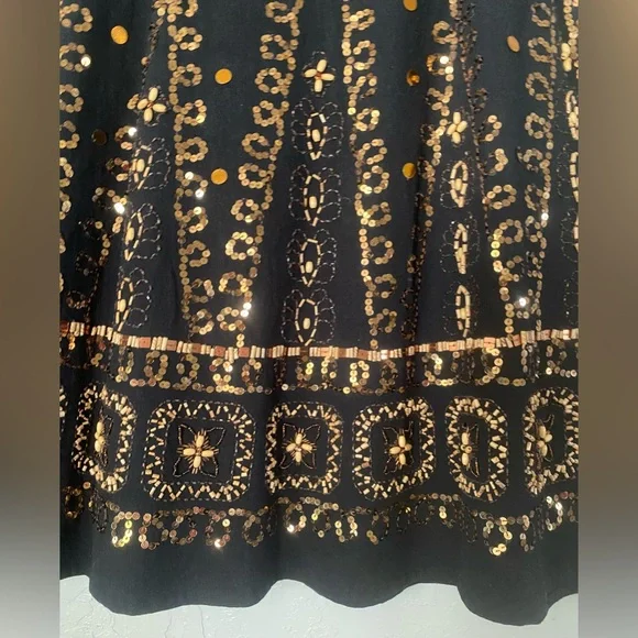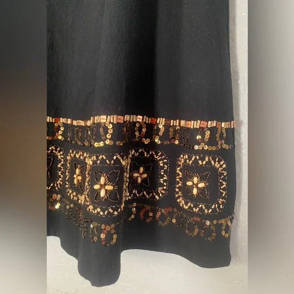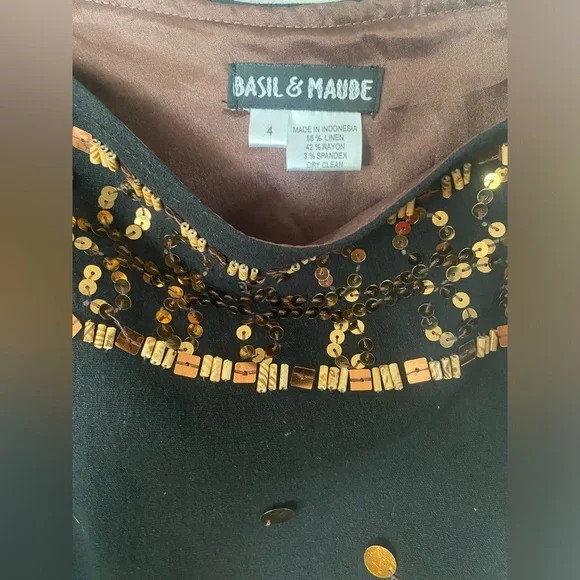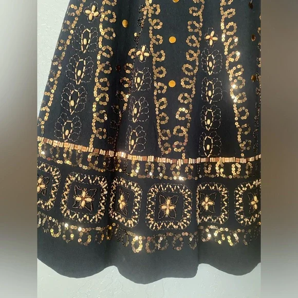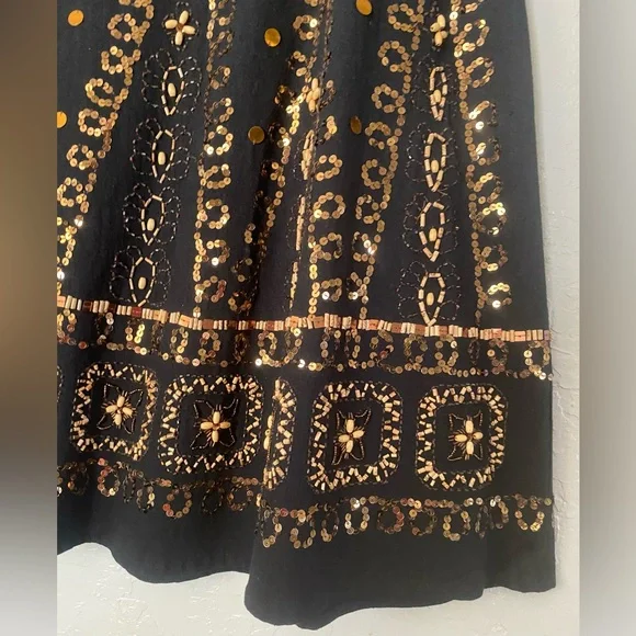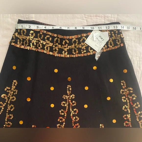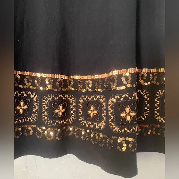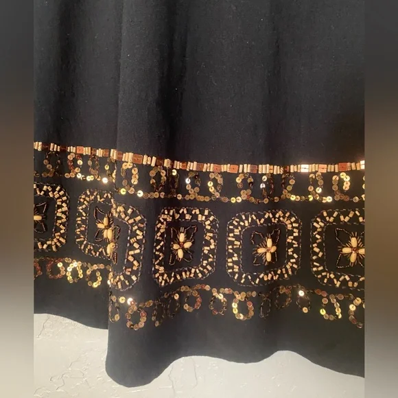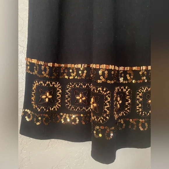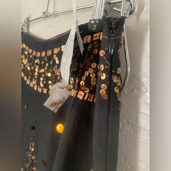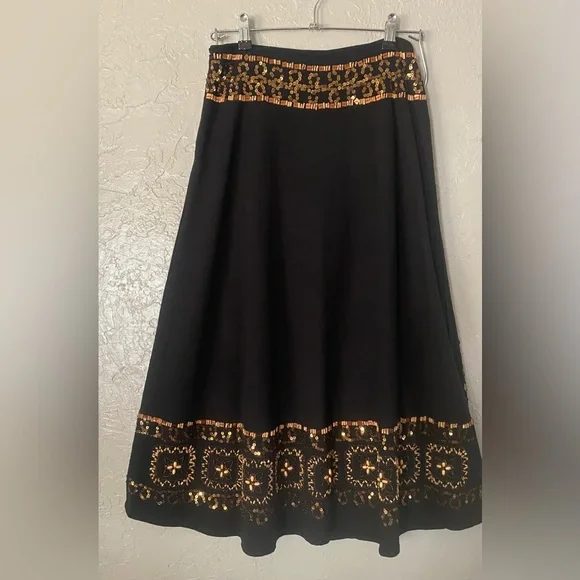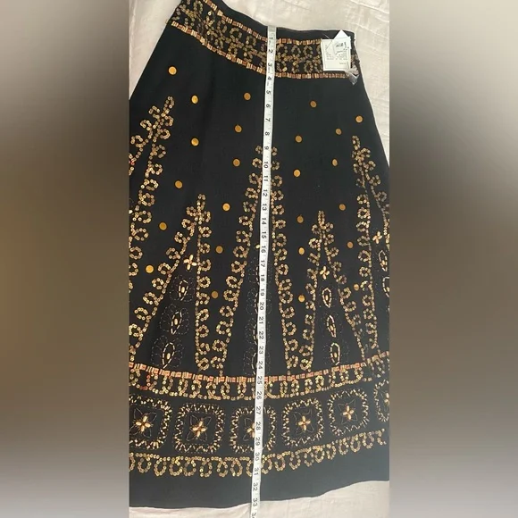Add a touch of glamour to your wardrobe with this stunning Basil & Maude midi skirt. The skirt features a beautiful black color and is made of a blend of spandex, rayon, and linen with a canvas fabric type. It has a zip closure and is embellished with beaded and sequin accents, making it perfect for any party or cocktail occasion.The skirt is lined and has a swing design, ensuring a comfortable and flattering fit for women of all sizes. It is dry clean only and suitable for all seasons, including winter, summer, fall, and spring. This skirt is perfect for those who love the bohemian and festival theme and is a must-have for any fashion-forward woman.NWT!!