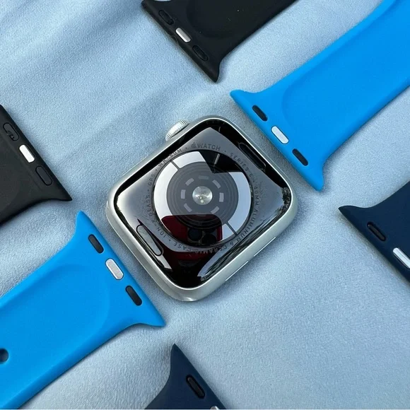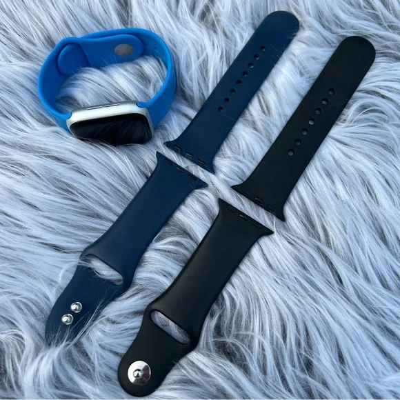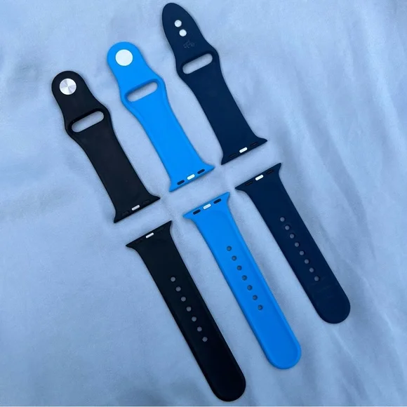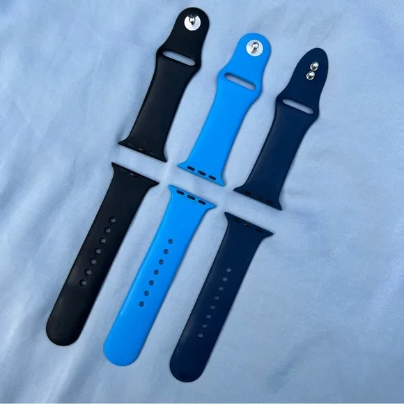 These are accessory watch bands to fit your Apple Watch (Apple Watch not included, these bands are not Apple brand.) A great comfortable fit with a secure pin-and-tuck closure system. These are a soft silicone material which is durable and strong, yet lightweight and comfortable for all day and night wear. They are waterproof and easily wiped down to stay clean.Sizing: All 3 will fit Apple Watch width of 38mm to 41mm, and are for Small/Medium or 140–190mm wrist sizes.Colors: Bright Cerulean/Capri Blue, Navy Blue, and BlackCondition: New without tags, never worn as these were not my favored colorsBrand: One is Epic Watch Band, the other 2 are not branded(Buyers Notes: Additional items shown in photos are for illustrative purposes only and are excluded from the sale, such as the Apple Watch and blanket. This sale is for the bundle of 3 bands shown. Colors of products in photos may vary on different devices. Manufacturer stock photos included when available. Please reach out if you have further questions—I’m here for you!)