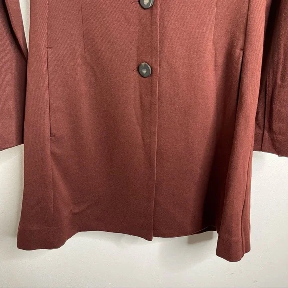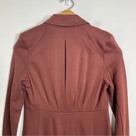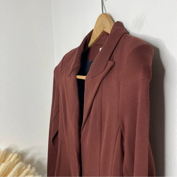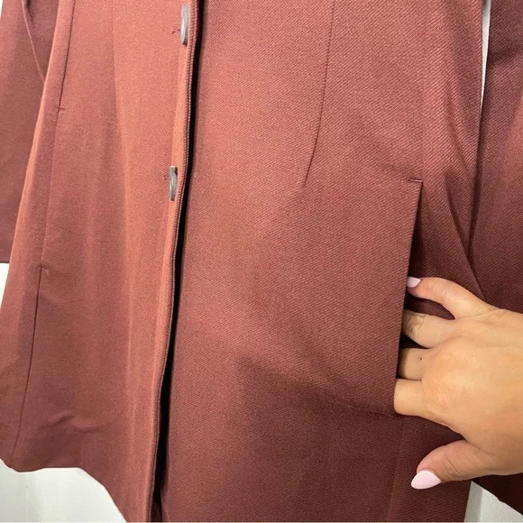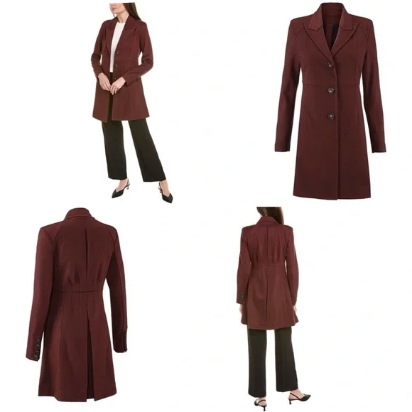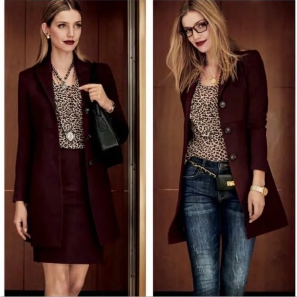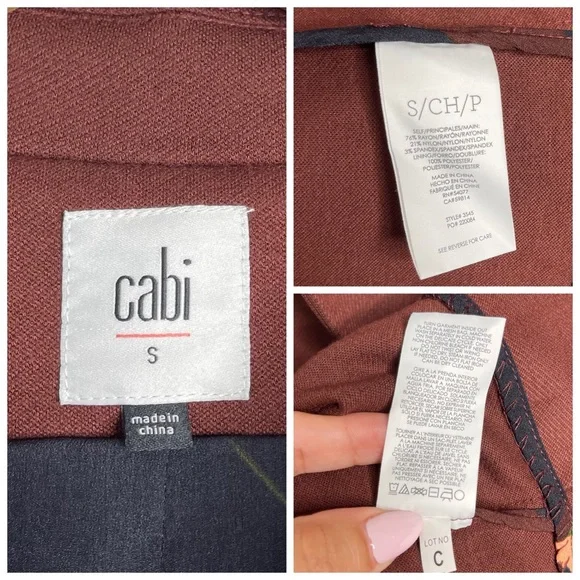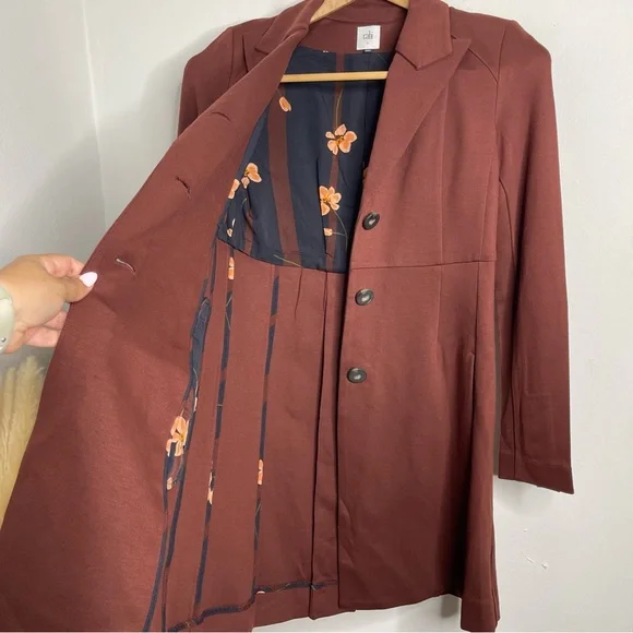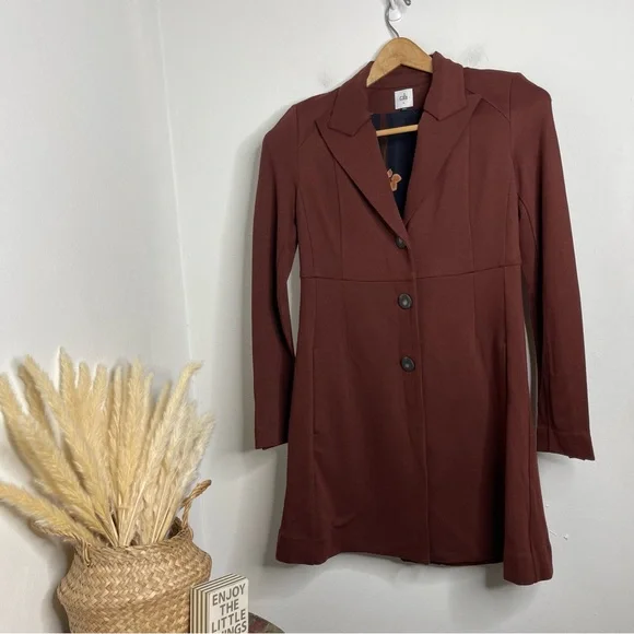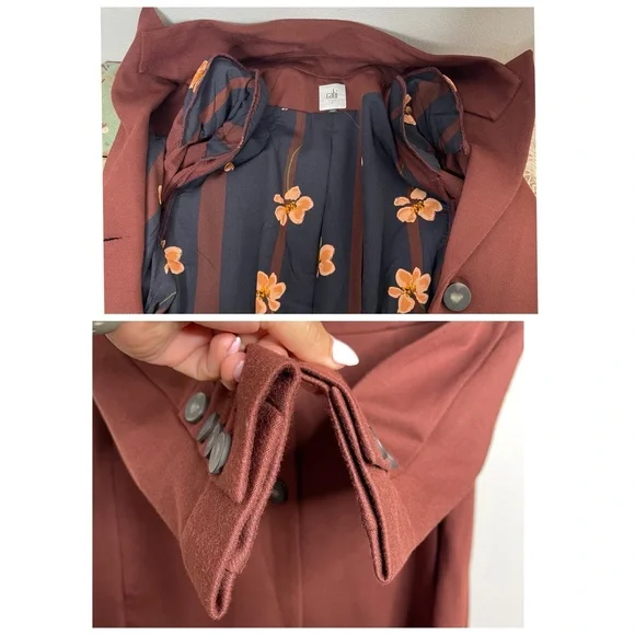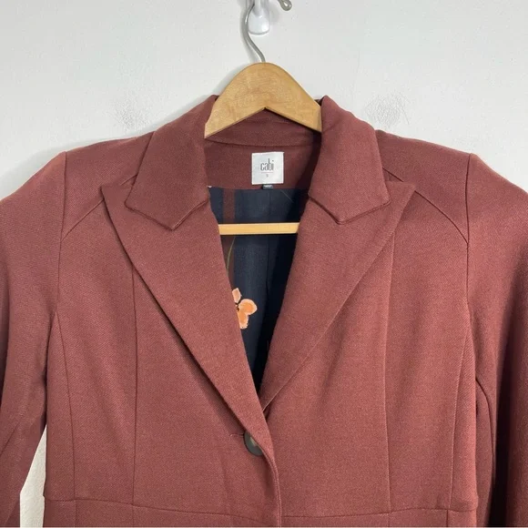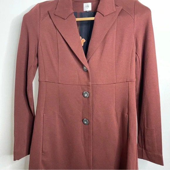 New with out tagsCAbi 3545 Fall Boss Long Jacket in Currant Wine Wine-Burgundy heavy ponte fabric. Vintage inspired details.Seaming and tucks at the back waistline for a fitted and classy silhouette.The uniquely notched neckline takes inspiration from an undone bowtie, while tucks at the back waistline and flattering seaming emphasize the sleek silhouette of this sophisticated, structured jacket.Features: long sleeves, three button closure front, button accent on cuffs, inseam pockets, inverted back pleat detail, mid thigh length, shoulder pads, slim fit, Washing instructions: machine wash in mesh bagFabric: rayon, nylon, & spandex with polyester liningMade in: ChinaSize: SPit to pit 17.5”Waist 16”Length 34.5”Sleeve 25”Shoulder to shoulder 16”Style Profile: bold, girl boss, classy, sophisticated, modern, stretch, layering, office, career, statementS6