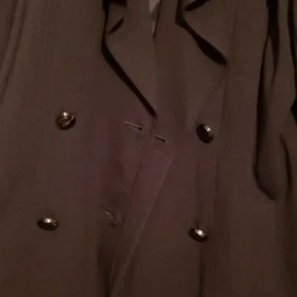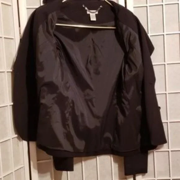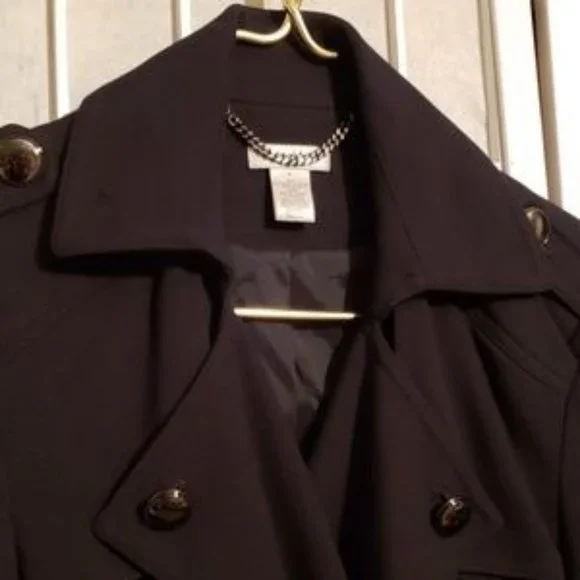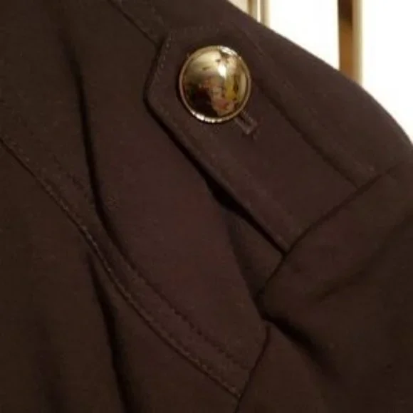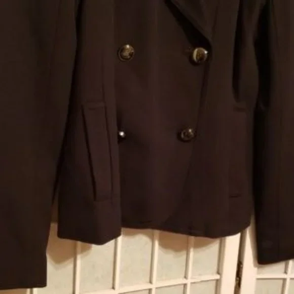 CACHE DOUBLE BREASTED PEACOAT SZ 4, 75% RAYON/16% NYLON/9% Spandex,LINING: 94% Polyester, 6% Spandex , previously worn, insignia chain in neck facing, black chrome colored buttons, loops, welt pockets,epaulettes,collar,button lapels, very soft fabric, lined,ARMPIT TO ARMPIT: 18", BUST: 36", WAIST: 32", ARMPIT TO HEM: 16", BACK LGTH: 25", FRONT LGTH: 17", SLEEVE LGTH: 25 1/2", CUFF: 9",