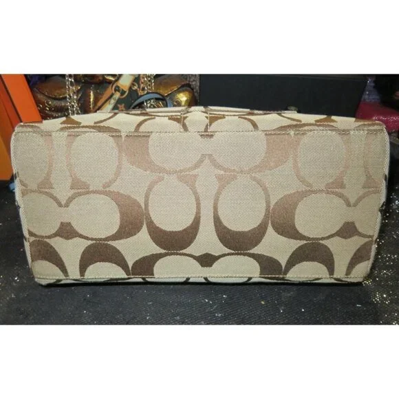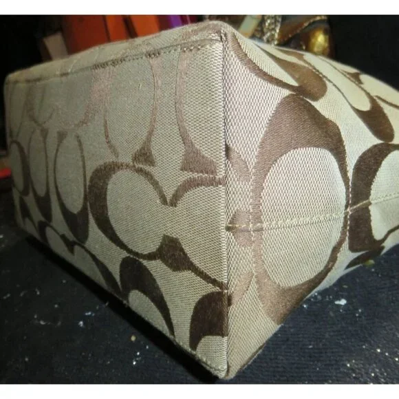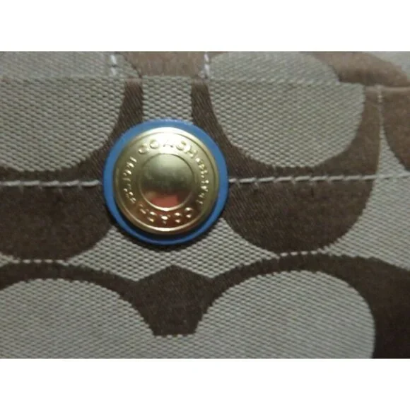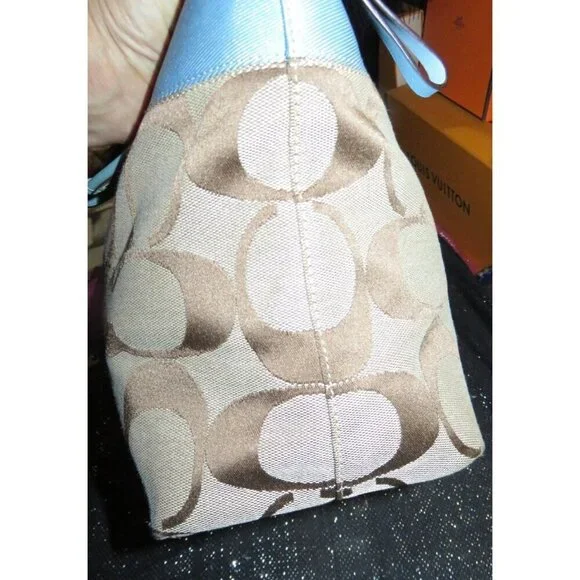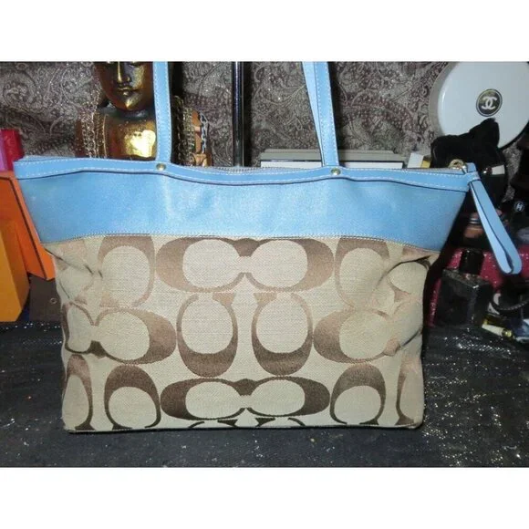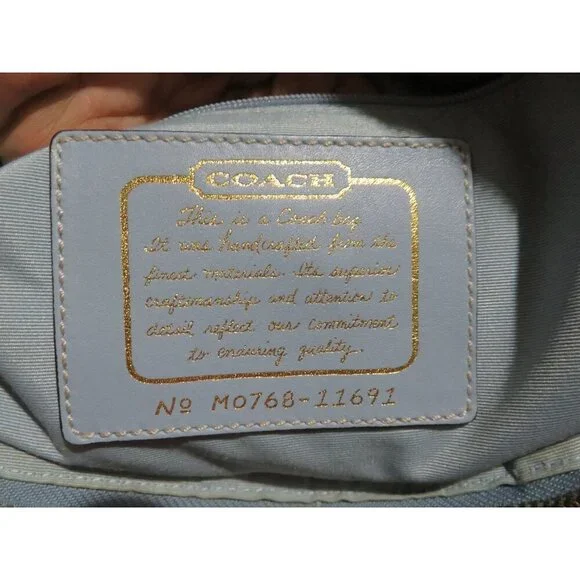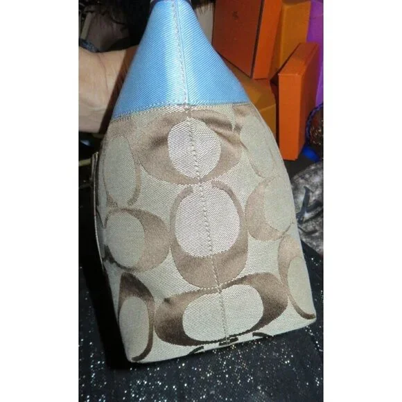 This Coach 2007 Cursive Creed Limited Edition Tote is a chic blend of khaki and baby blue canvas and leather. Sized at 9.5 X 12, it's perfect for those who love a timeless style with a unique twist.Used but cared for/freshly cleaned inside and out once by me, I even got a few rogue pen ink marks out/probably could use one more (white vinegar and baking soda paste works wonders!)All used bags may have the following✔️Discoloration✔️Sign of used✔️Scratches scuffing✔️rubs✔️Pls check the picture closely as it part of the description.