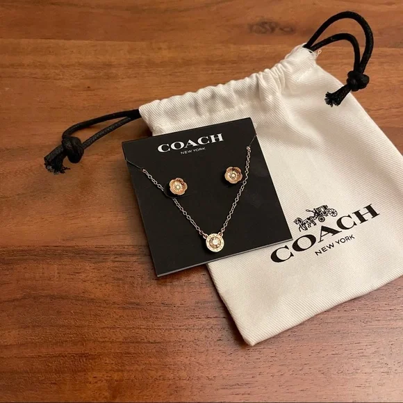 COACH Open Circle Necklace And Tea Rose Stud SetThis delicate necklace and earring set in rose gold-plated brass is a must-have for any jewelry lover.Necklace set in rose gold-plated brass embellished with silk colored stoneCOACH engraved signature logo at outer edgeRose Gold Plated brassLobster clasp closureNecklace: adjustable 16" - 18" (L)Earrings: 1/4" (L) x 1/4" (H)