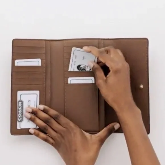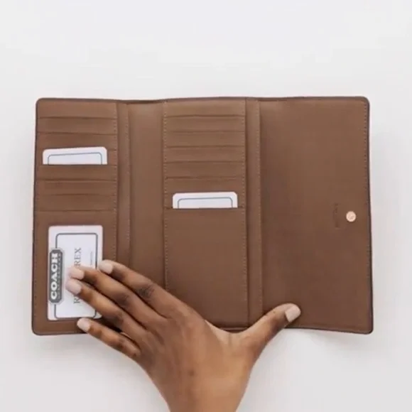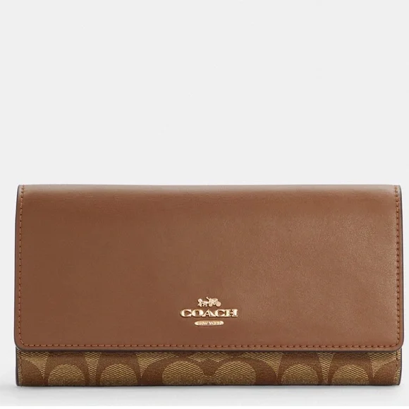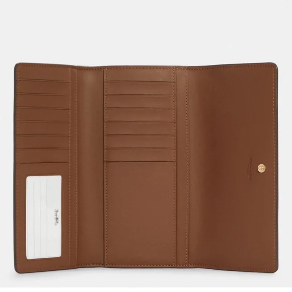 Coach Slim Trifold Wallet In Signature CanvasGold/Khaki Saddle 2Coach Slim Trifold Wallet In Signature CanvasC5966IM/KHAKI/SADDLE 2IME74NWT Authentic Style NumberC5966MeasurementsLength: 7.75"Height: 4.25"Width: 1.0"MaterialsSignature coated canvas and smooth leatherFeaturesInside zip coin pocketThirteen credit card slotsSnap closureFull-length bill compartment