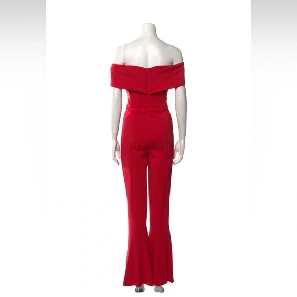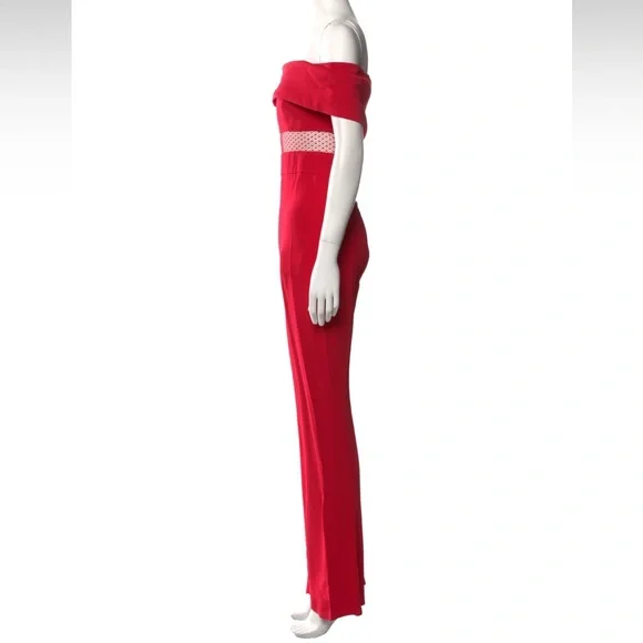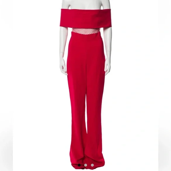 Cushnie cutout French dot lace midriff jumpsuit. Flared leg. Sooo flattering!Color: Watermelon (But it looks bright red in person, not pink at all.)Self: 95% viscose, 5% elastanContrast Fabric: 61% viscose, 39% nylonLining: 95% silk, 5% elastanMade in USADry clean onlyFoldover fabric overlayHidden back zip closureMesh lace detail at waistManufacturer Style No. S19 119703 54Model is wearing size 2. So is the human seller. (It’s a little tight on me.)My measurements: Bust, 34”Waist, 27”Hips, 36”Cushnie sizing chart for size 2:Bust: 26.25"Waist: 23.5"Hip: 27.75"Rise: 10.75"Inseam: 31"Leg Opening: 26.25"