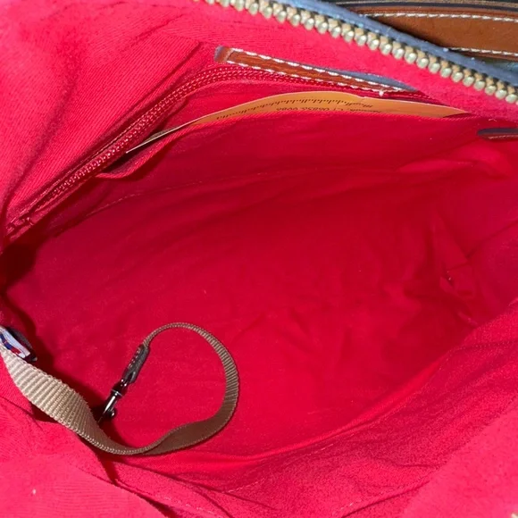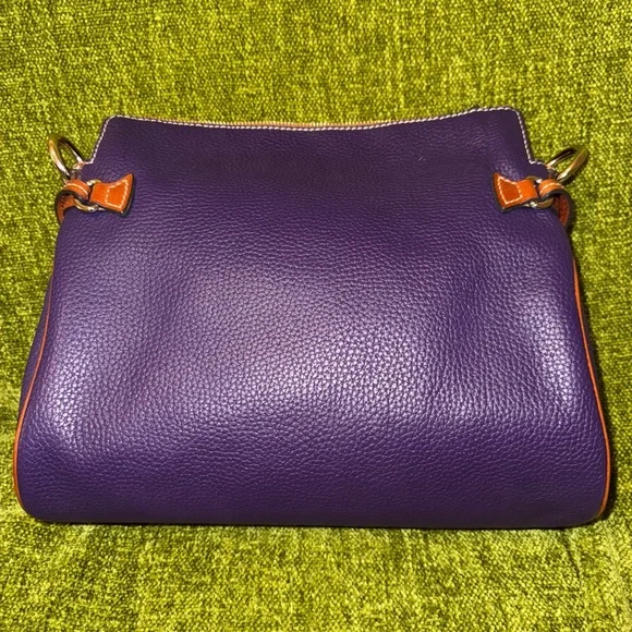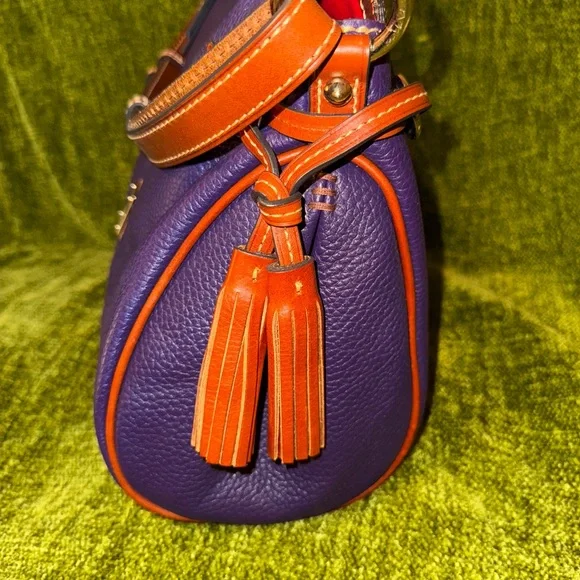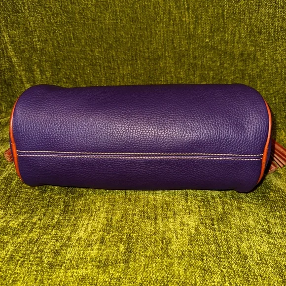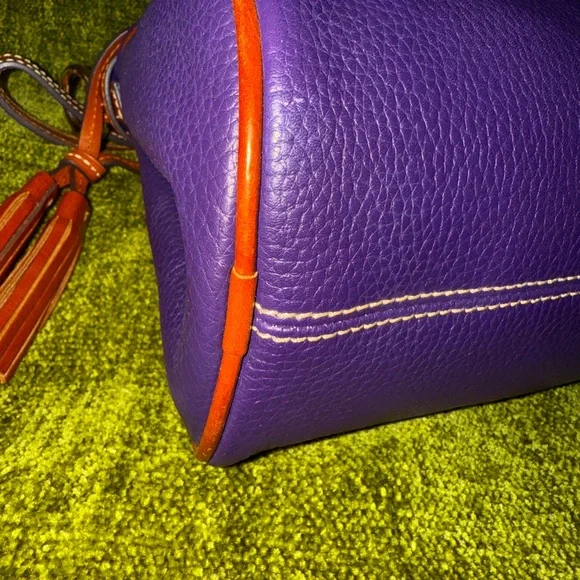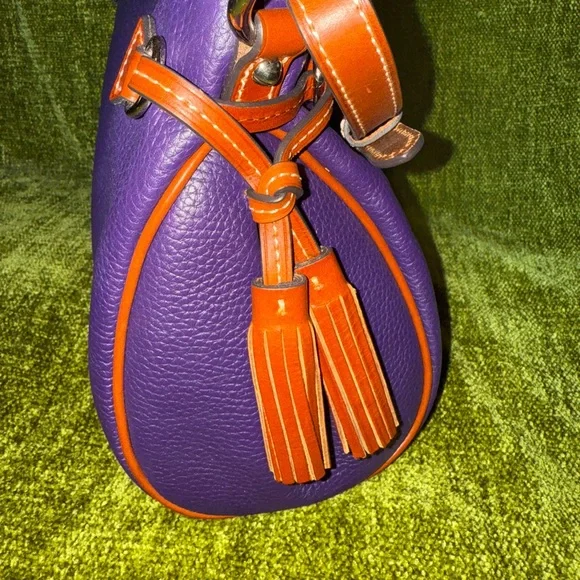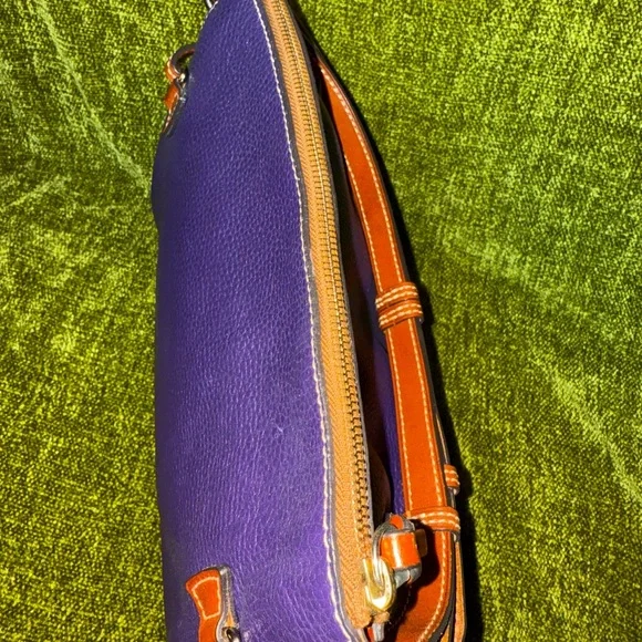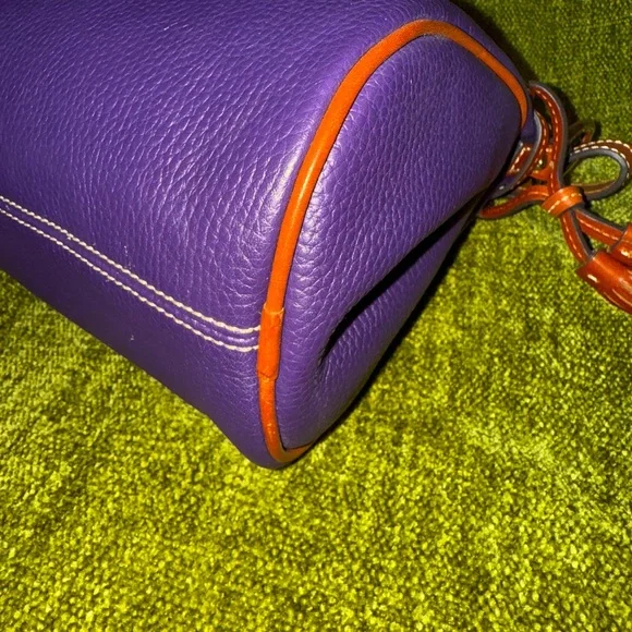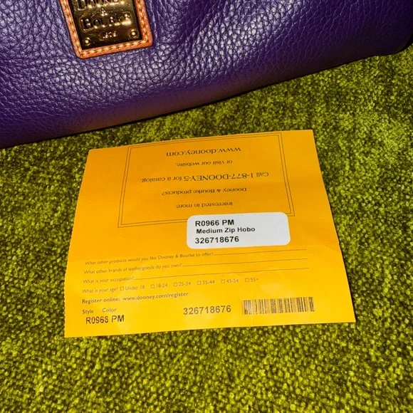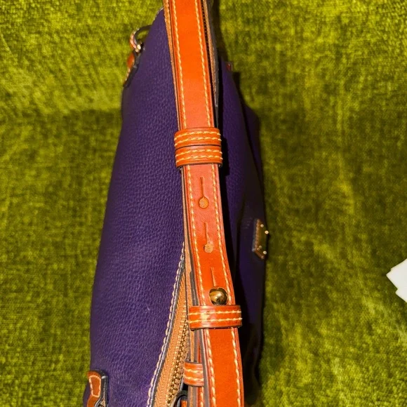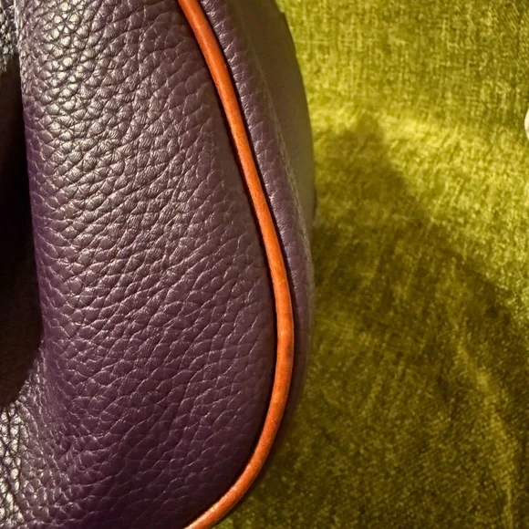 Dooney and Bourke Medium Zip Hobo in Plum 💜.This is cute bag that can be carried on the arm or on the shoulder. The strap is adjustable. Bag has zip top closure. The interior has multiple slip pockets and 2zipper pocket.Bag was only carried a few times.Exterior body has a small scratch on bottom. The trim on one side has some discoloration, see photos. Bag comes with dust bag and will be shipped with netting on the tassels to keep them from bending.
