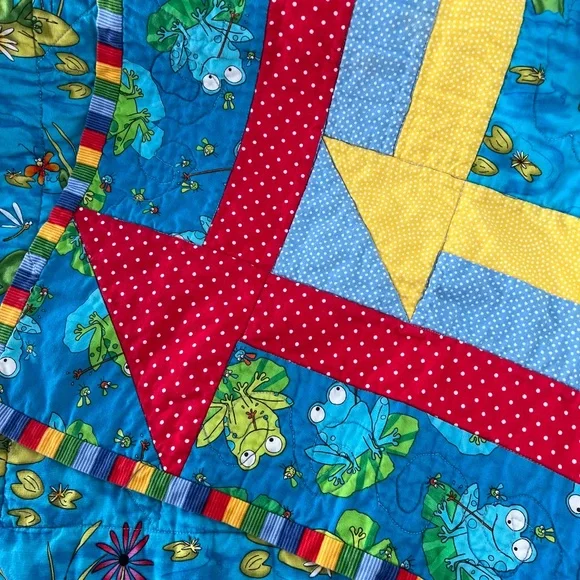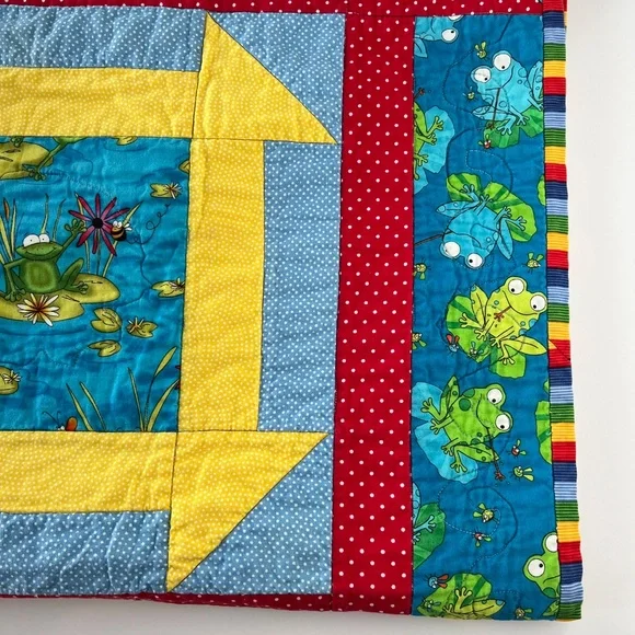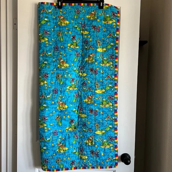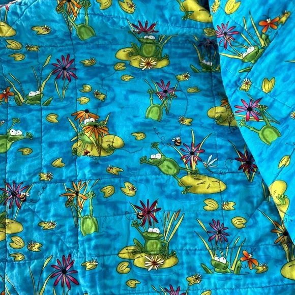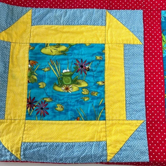 Handmade colorful reversible quilt with Frogs Great quilt for a toddler bed, picnic at the park, play mat, travel blanketMeasures approximately 42.5" x 42.5"Preowned in great condition See pics for details **As a maker/crafter myself, I love rescuing handmade items from antique shops and thrift stores. I hope they find a loving home!Pre-loved items are pre-washed in gentle/clean detergent Ships from a smoke free pet friendly home **Colors may appear slightly different due to monitor screens/lighting