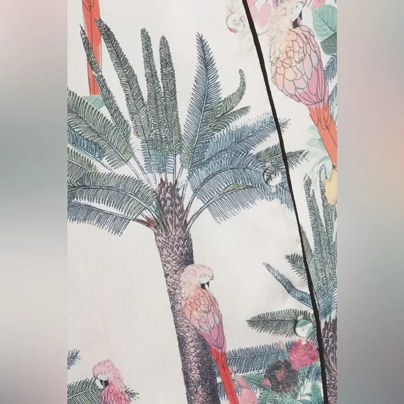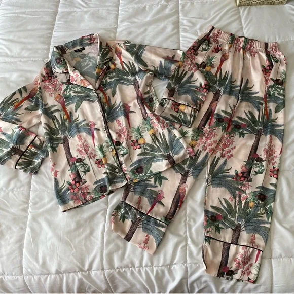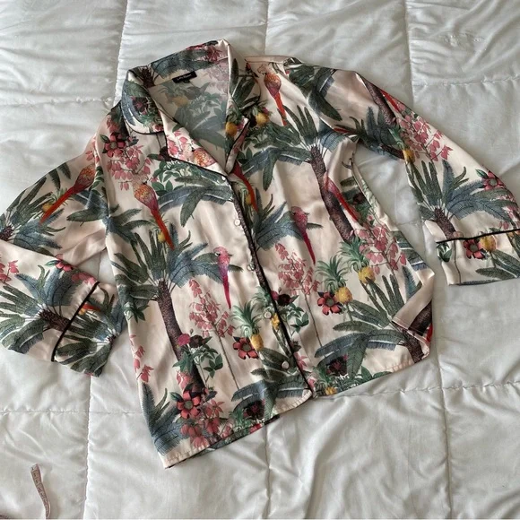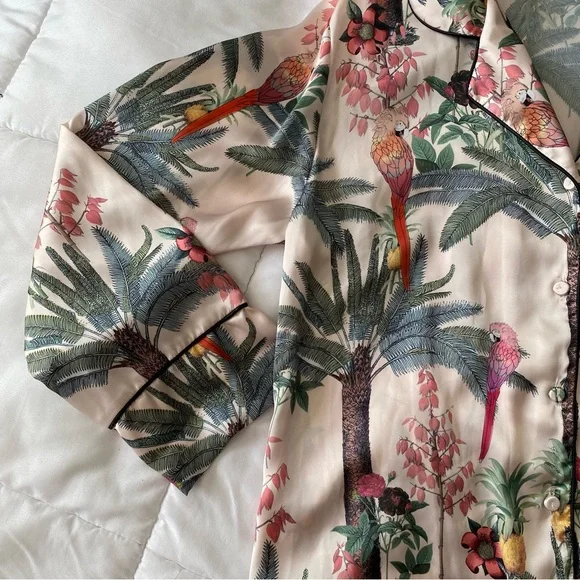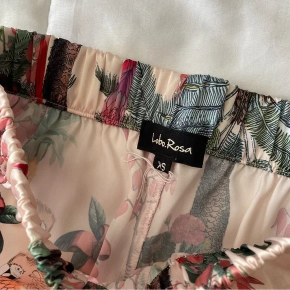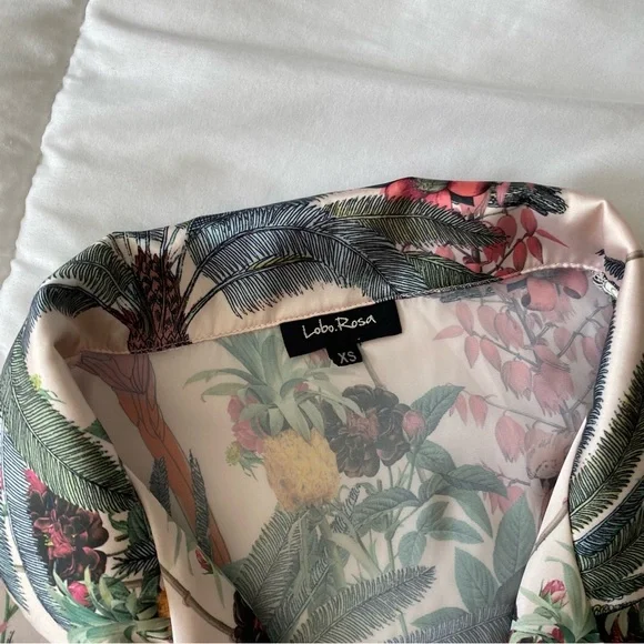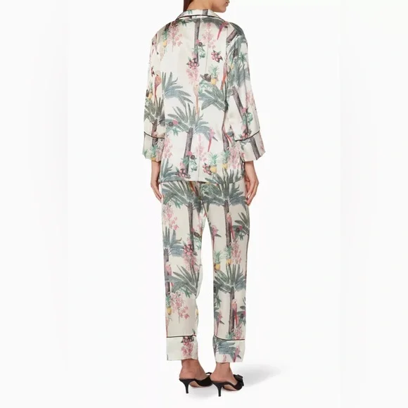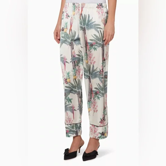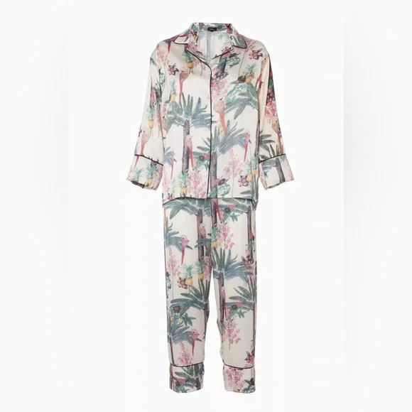 Lobo Rosa Multi-Coloured Palomino Pajama SetSize extra small Lobo Rosa's SS18 tropical print collection will lend a refreshing take on vacation edits. This Palomino Pajama Set is a prime example of the label's take on modern-fit silhouettes inspired by boudoir styles. The notch lapel-style collar, patch pockets, and pant cuffs are framed with black piped edges for a refined finish. Keep the print in focus with neutral-toned accessories for maximum impact.