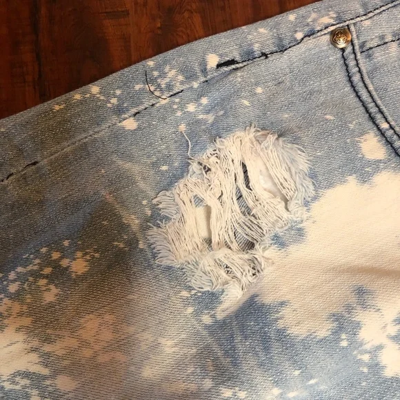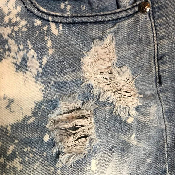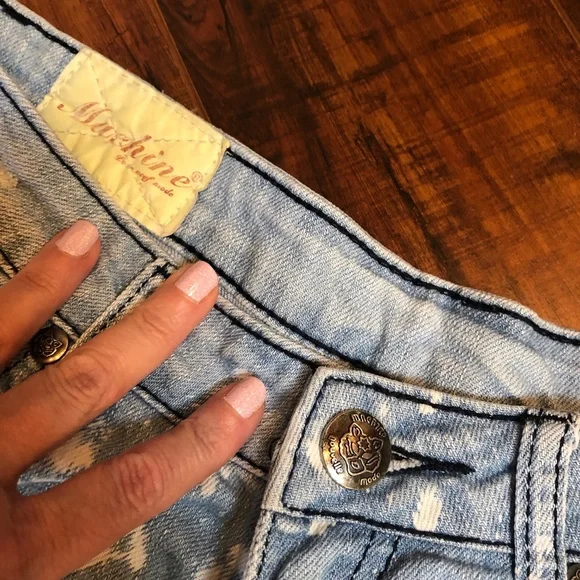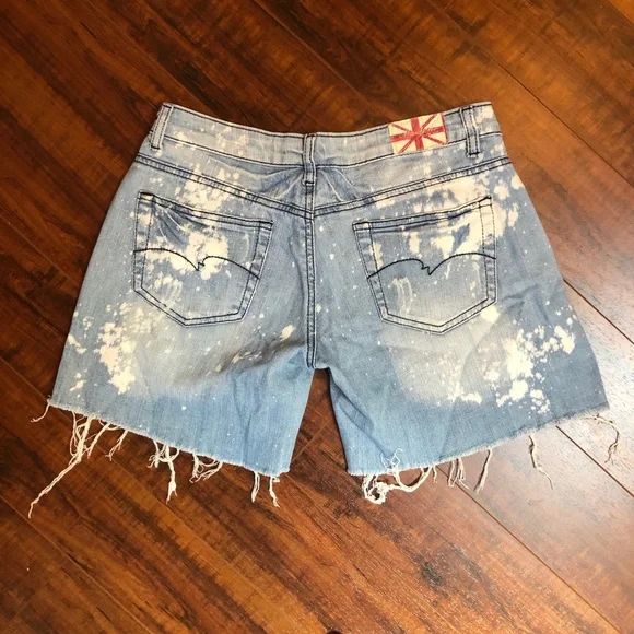 Machine sz L 30 Festival Factory Distressed Acid Wash Cutoffs Denim Jean ShortsMaterial: Cotton, elastaineNormal wear from being laundered, and being used on the TV Set as wardrobe. Great paired up with tights and boots!!!Oooh lala! / Location: lt55 Approx Measurements laying flat:Waist: 15.5" taken laying flatRise: 7.5" (low)Inseam: 6"