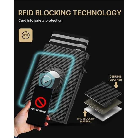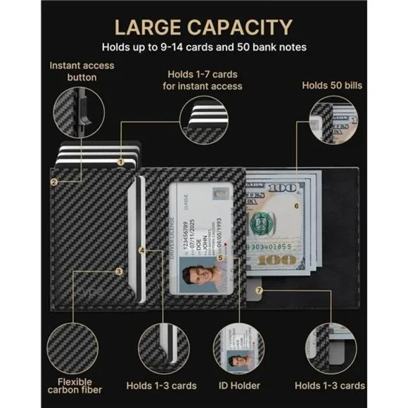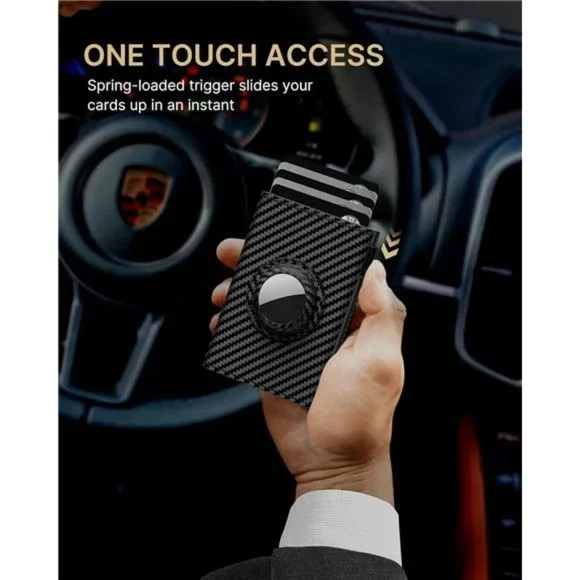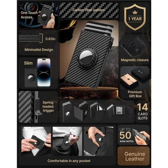 🧿【LARGE CAPACITY】 With 8 card slots, 1 ID window, and 1 note slot, this wallet has plenty of room for all your essentials. It can hold up to 9-14 cards and 20 bills, so you can carry everything you need without feeling weighed down.🧿【TOP-QUALITY MATERIALS】 This wallet is made from top-grade genuine leather and 6063 T5 Aluminum, so it looks and feels great while also providing excellent durability and longevity. The leather is soft and supple to the touch, and the aluminum adds a sleek, modern touch.🧿【QUICK CARD ACCESS】Tired of fumbling around with your wallet to find the right card? This men's wallet features a pop-up card case that can hold up to 6 cards, and the desired card can be quickly accessed with the press of a button. No more holding up the line at the checkout!🧿【COMPACT SIZE】Measuring just 3.86 * 2.56 * 0.83 inches, this wallet is small enough to fit easily in your front pocket, back pocket, or jacket pocket. No more bulky, uncomfortable wallets!🧿【SECURE AIRTAG HOLDER】Do you worry about losing your belongings when you're out and about? This wallet is designed with AirTag holes, so you can attach an AirTag to help you keep track of your wallet. The AirTag holder is secure and prevents the AirTag from drawing out, giving you peace of mind.