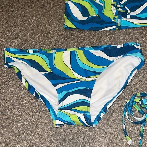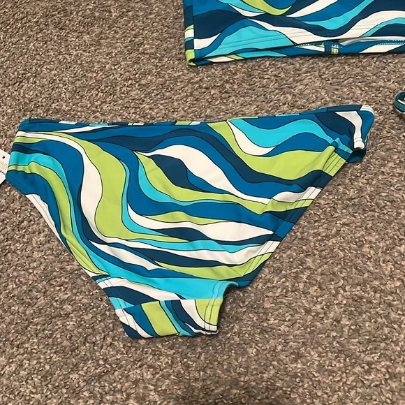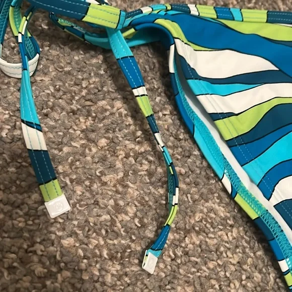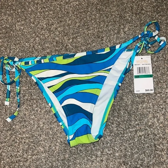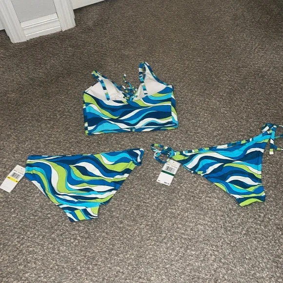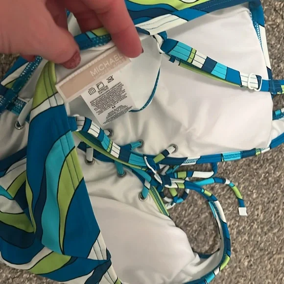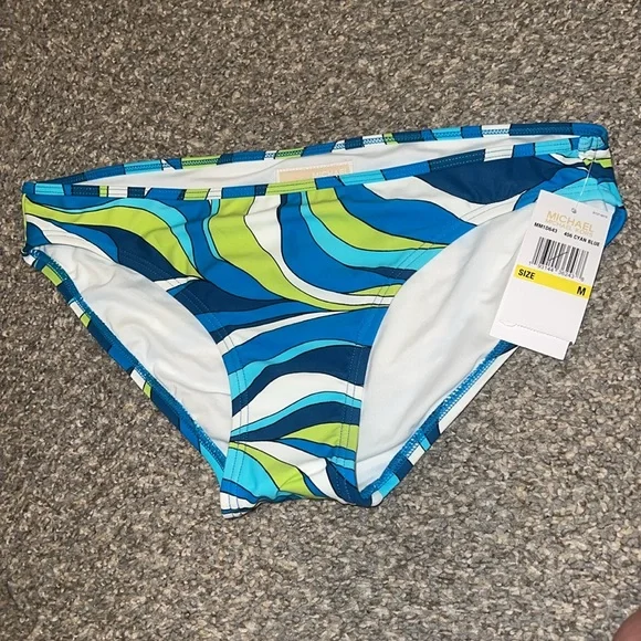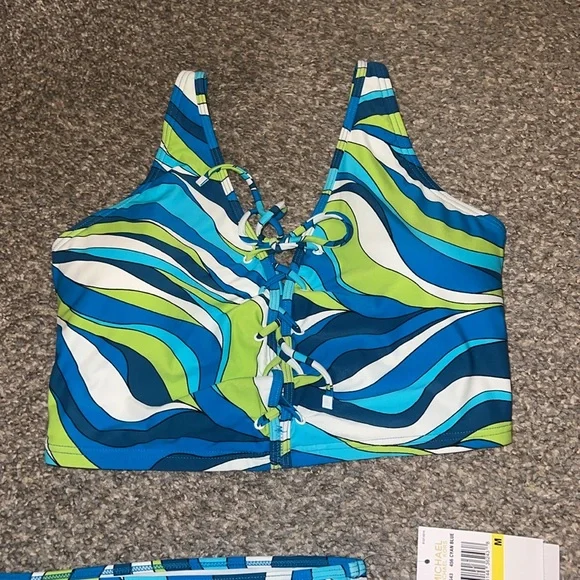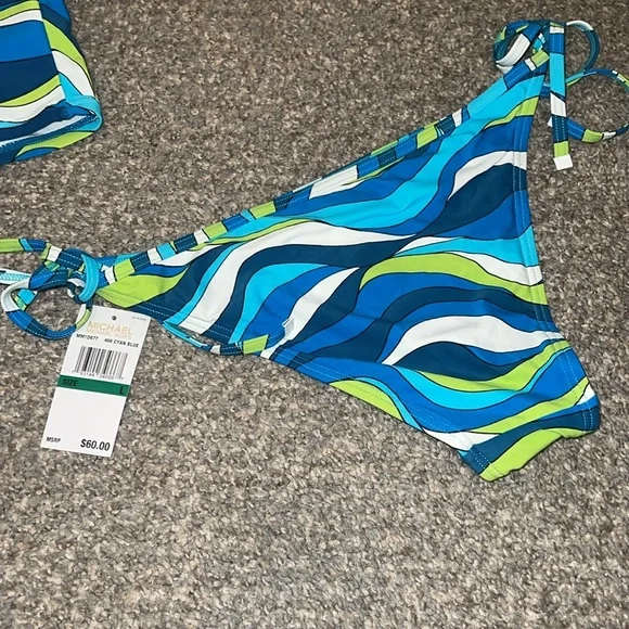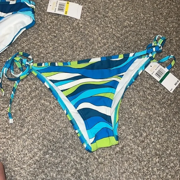 Vibrant bikini set with a wave pattern. Features a lace-up top and side-tie bottoms. Perfect for beach days. Michael Kors bikini sets. Top is a size medium and the bottoms are a size medium and ones a large. They are all new, the tops tag is missing but it’s new never got to wear this one. You can choose which bottoms you want or buy all 3 pieces.