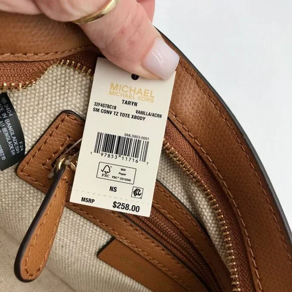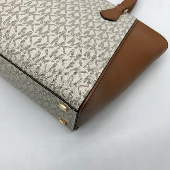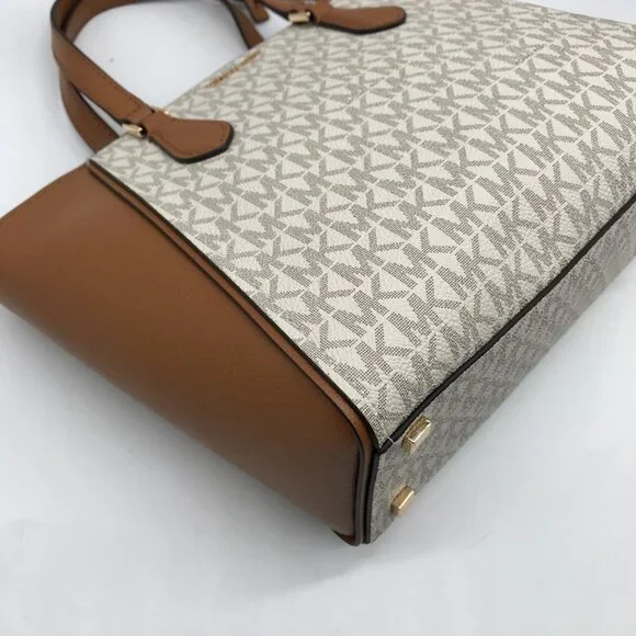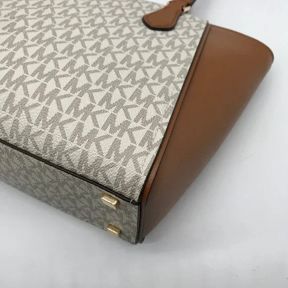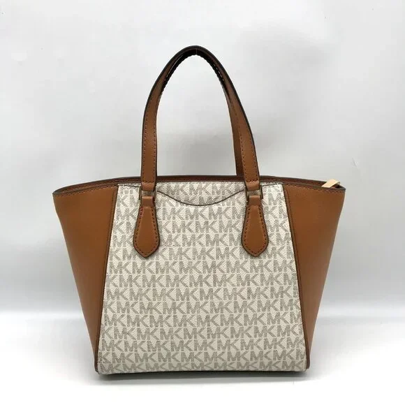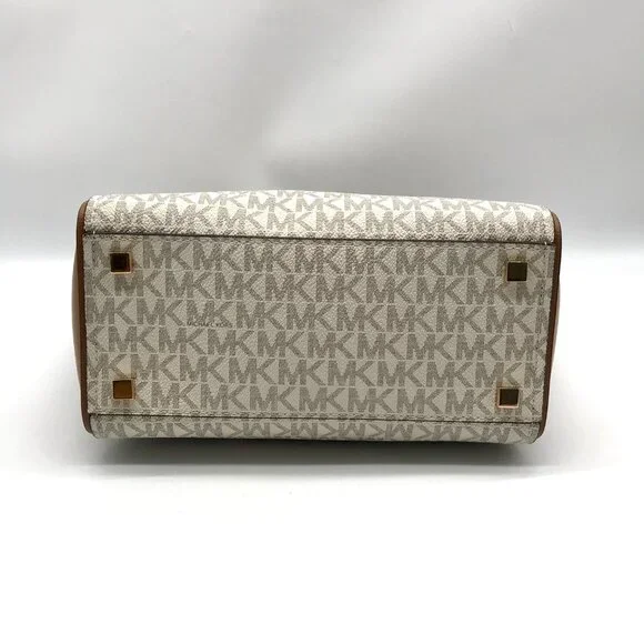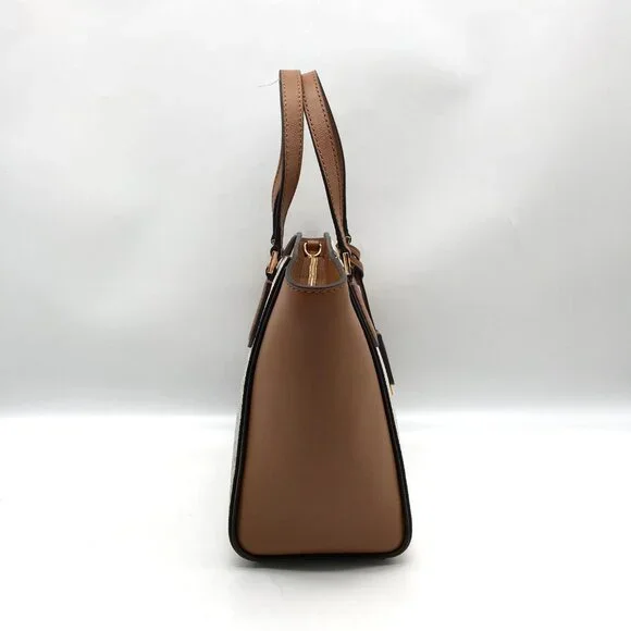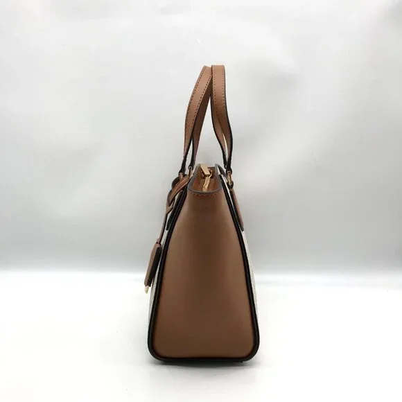 Carry sophistication wherever you go with the Michael Kors Vanilla & Acorn Coated Canvas Small Taryn Top Zip Satchel – a stylish and versatile piece for the modern woman. (6030-M0319-4.25)Features:• Material: leather, coated canvas• Color: vanilla, acorn• Closure: zipper• Hardware: gold• Strap: double flat handles• Exterior: "MK" bag charm, 4 protective bottom feet, back slip pocket• Interior: beige linen lining, zipper pocketSize: Womens 11"L x 4"W x 9"H handle drop: 5.5"Condition: New With DefectsThis bag is new with tags, but it is missing a crossbody strap.One Purse empowers women to build healthy and sustainable lives. All proceeds go to women overcoming abuse, addiction, exploitation, and trafficking through education and employment in our social enterprise. * Products are measured at the widest and tallest points, excluding handles. Enjoy great customer service and fast shipping!