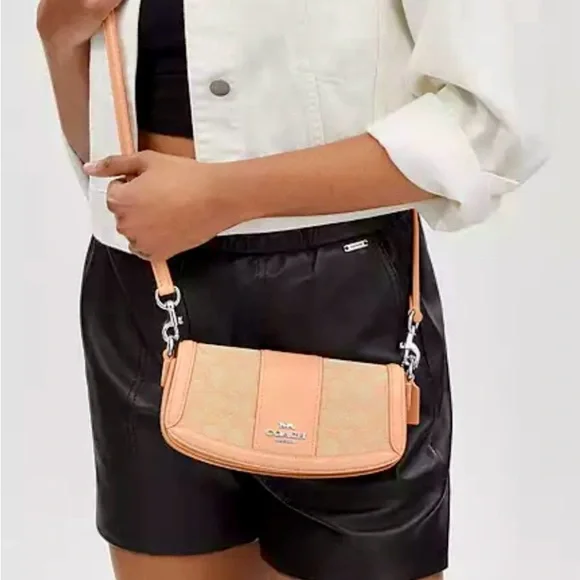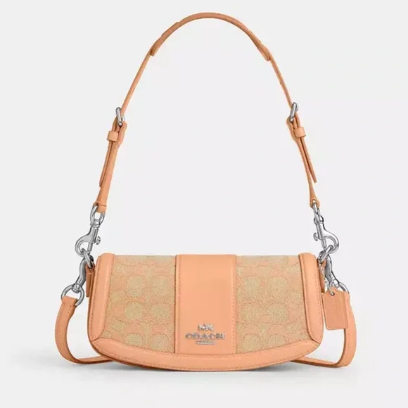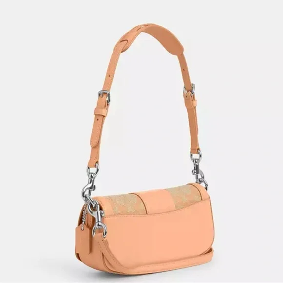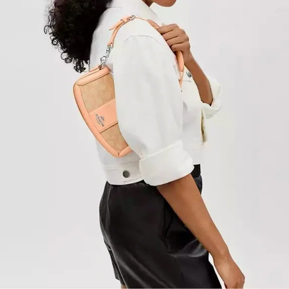 Brand New with the and absolutely gorgeous describes this Authentic CoachAndrea Small Shoulder Bag In Signature Jacquard Silver Faded Blush.Style Number: CT759Length: 8.25"Height: 4.25"Width: 2.0"Signature jacquard and refined calf leatherFabric liningDetachable strap with 8.75" dropDetachable long strap with 22.75" drop for crossbody wearOutside open pocketInside multifunction pocketTwo credit card slotsSnap closureExclusive of trim, this Coach piece is crafted of our Signature jacquard made from a blend of organic cotton and recycled polyester.