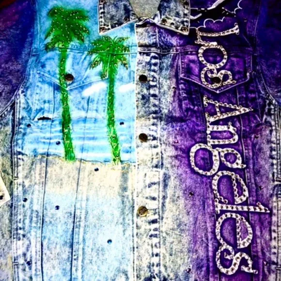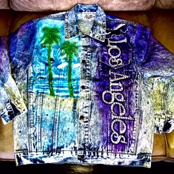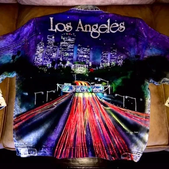 Alamo Vintage Jacket -Los Angeles City of Angels - Collectors Piece -Rare $800 - Brand New - MediumThis jacket is in brand new condition, vintage, and copyrighted 1987.This jacket was designed and produced by Alamo Designs.We have several Alamo vintage jackets both rare and less rare that were produced in the 80’s and early 90’s. They have been stored in sealed poly bags and are in their original condition.The jackets were a hot fashion commodity in the eighties. Flashy and expensive, they were a favorite among celebrities. Dolly Parton, Mike Tyson, Brooke Shields, Burt Reynolds — anybody who was anybody wanted to be photographed in one. Michael Jackson wore a customized leather version on the cover of the Bad album.Today, the jackets, with their boxy fit, stonewash finish, elaborate airbrushed designs, and sparkling Swarovski Austrian crystals are having another moment in fashion. Tastemakers like Nicki Minaj, ASAP Rocky, Miley Cyrus, and Frances Bean Cobain have all recently been photographed wearing the highly sought-after vintage Tony Alamo of Nashville jackets.