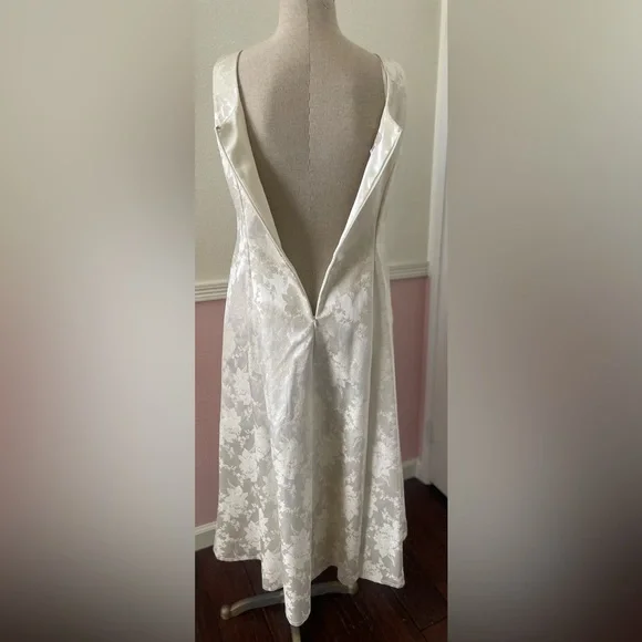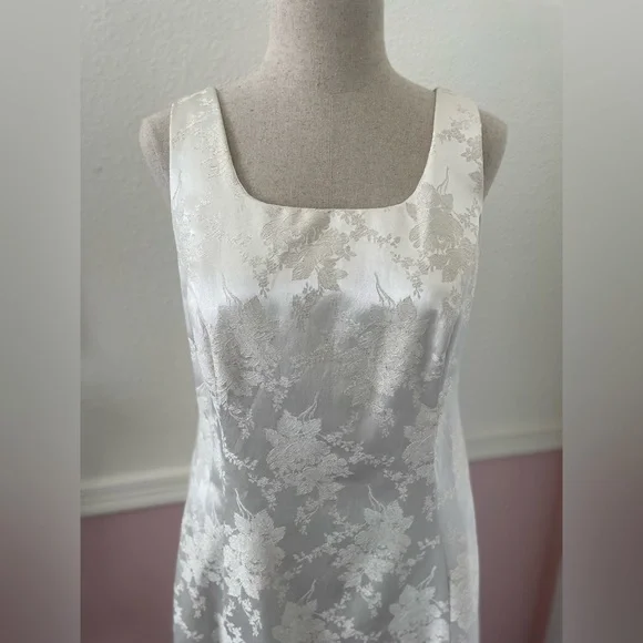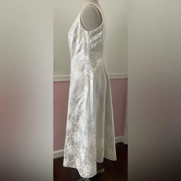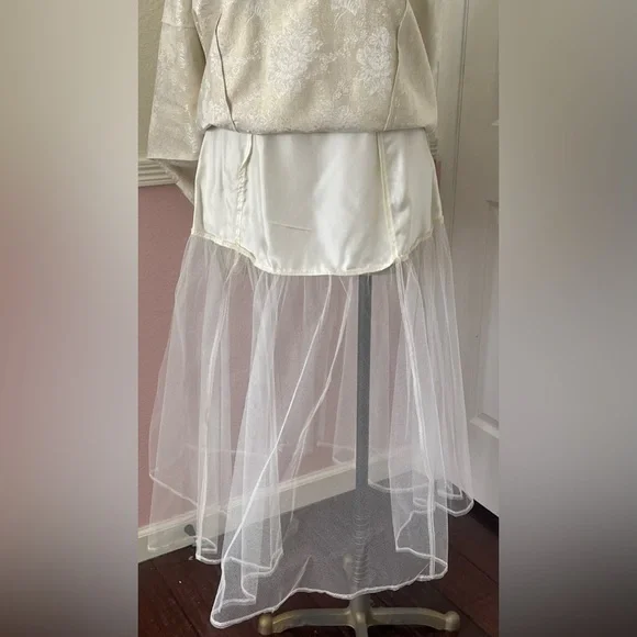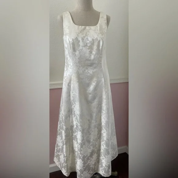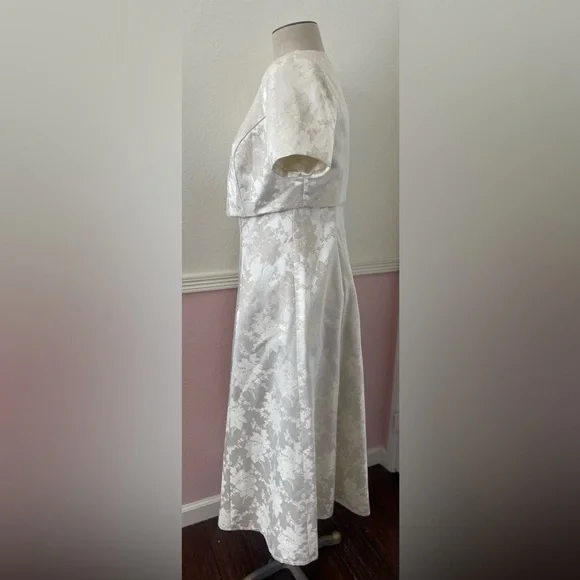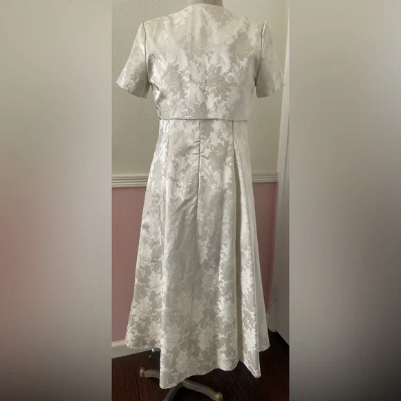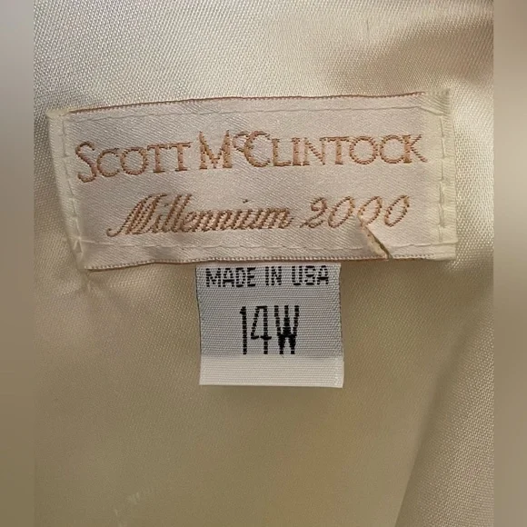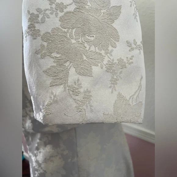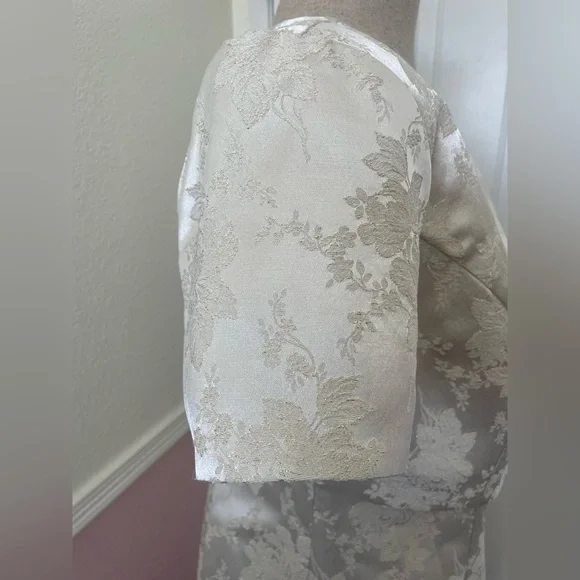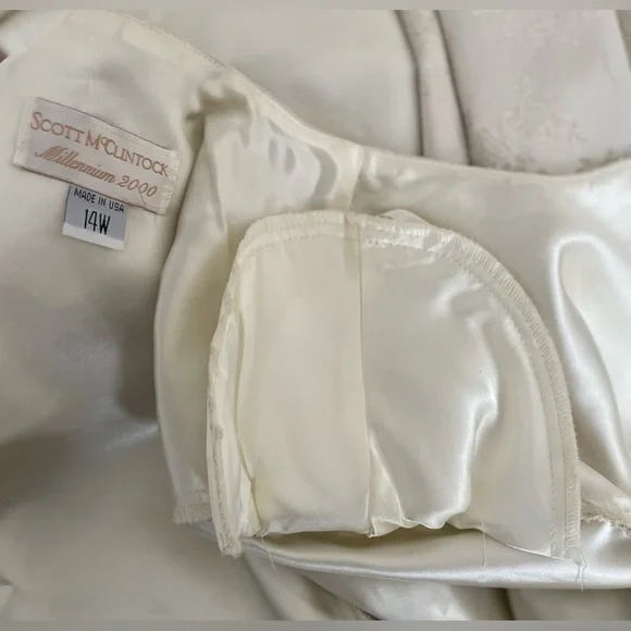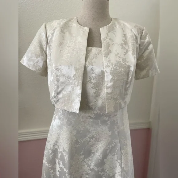 Vintage bridal gown millennium collection 2000Two piece, removable bollero, with shoulder pads small ink mark on sleeve refer to picture Detailed fabric with hint of silver zipper on the back Refer to picture and video please reach out with any questions 💜 measurements of dress laying flat: Underarm: about 21’Waist: about 20 1/2’Length: about 53 1/2’BoleroShoulders: about 17’Waist: about 19’ Length: about 17’