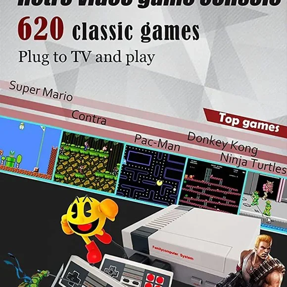 👍Bring you happy childhood memories:You can play many retro games. For example: action games, shooting games, sports games, fighting games, racing games, puzzle game.It some games repeat. Do not save progress.👍Play More Games:This is a Retro TV Video Game Mini Console with 620 built-in games from the 1980s (yeah - last century). We have collected a lot of last century’s classic games.👍Easy to Operate:The game console has a classic button game controller. The classic design is easy to start. You can start your childhood journey by pressing the button. Become the winner of classic games and enjoy endless fun. People's happiness is so easy.📦Package Included:1* Entertainment system console2* Classic controllers1* AV cable1*charger1* user manual❤️ Note:- If your TV does not have an AV port, you can use a converter (the converter does not ship) to switch to the HDMI port. The console itself does not have an HDMI port.