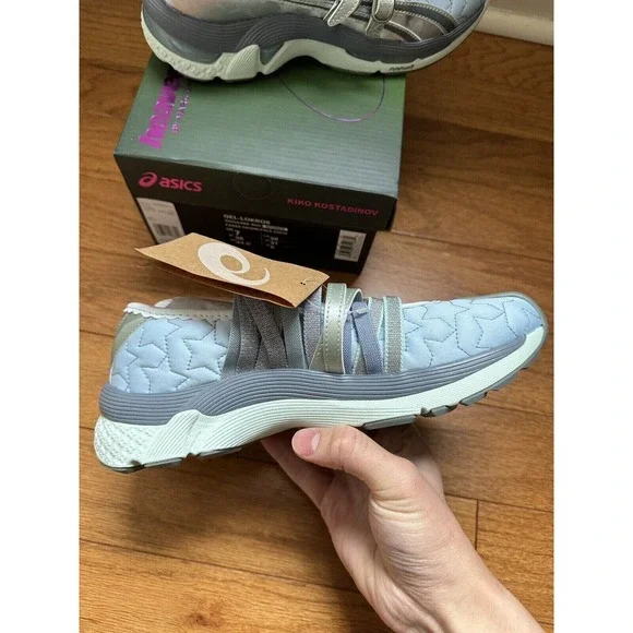 ANTICIPATED THREE NAME COLLABORATION SHOE HEAVEN BY MARC JACOBS × KIKO KOSTADINOV × ASICS. A MEETING OF MINDS CREATES THE GEL-LOKROS. A CHAOTIC MARY-JANE STYLE WITH BUCKLE AND ELASTIC FASTENINGS USING THE HEAVEN STAR MOTIF IN A QUILTING DESIGN AND THE REVISIT OF THE GEL-KIRIL TOOLING. SCRATCHED METALLIC PANELLING AND SHIMMER GEL. THREE COLOUR-WAYS IN TONES OF CHARCOAL, LILACS AND FADED PALE BLUES.