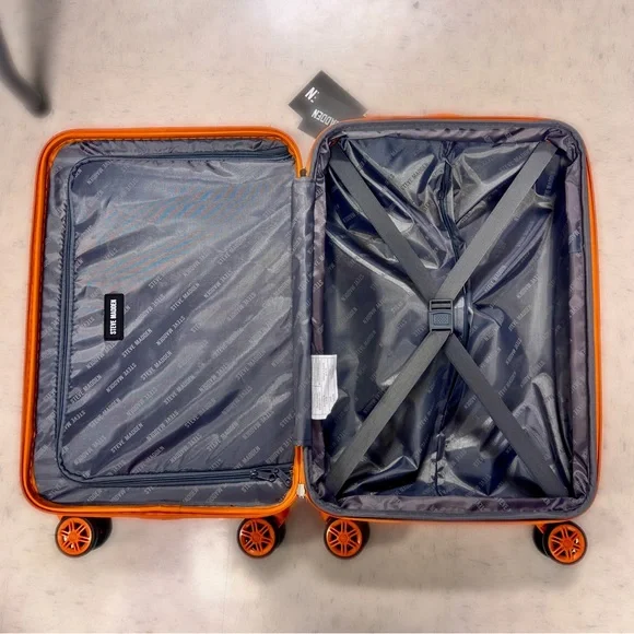 The Steve Madden Suitcase is a cutting-edge travel companion designed for the modern professional. Crafted from high-quality, durable materials, it features a sleek, minimalist exterior with a matte finish that exudes sophistication. The suitcase is equipped with advanced anti-theft technology, including a TSA-approved lock and reinforced zippers.Inside, you'll find a spacious main compartment with adjustable straps to keep your clothes wrinkle-free, along with multiple pockets and pouches for organized storage of accessories and documents. A dedicated laptop sleeve and a detachable garment bag add to its versatility. The suitcase glides smoothly on 360-degree spinner wheels, making navigation through busy airports effortless. With its ergonomic, telescopic handle and lightweight construction, the Steve Madden Suitcase is the ultimate blend of style, security, and convenience for the discerning traveler.