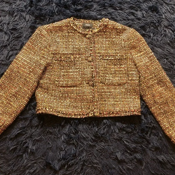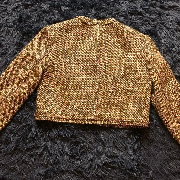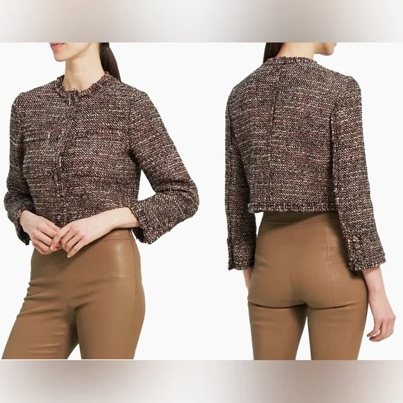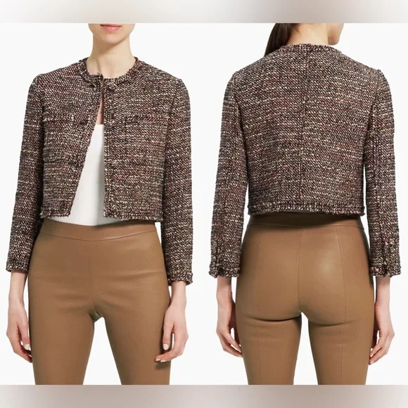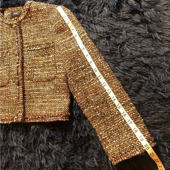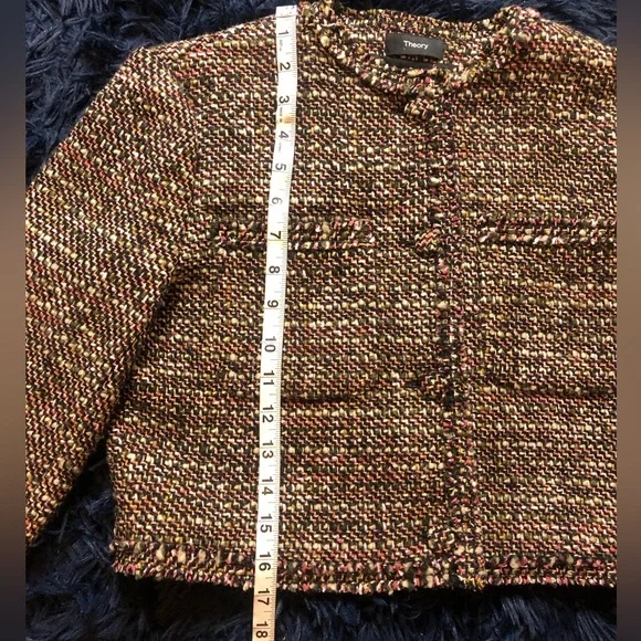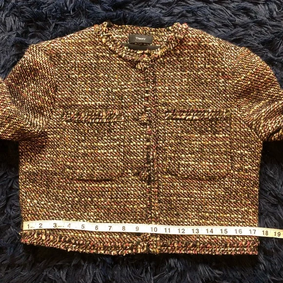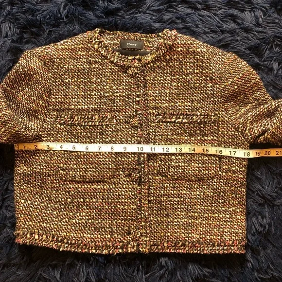 THEORYCropped Tweed Jacket. Size 4THEORY Tweed Flared Hem Mini Skirt. Size 8MATCHINGJACKETCollarless - Long sleeves - Front button closuresr - Front patch pockets - Made from a bold, novelty tweed with pops of color, produced by leading mill in Italy True to size, choose your normal sizeStandard fit, long sleevesHip length39% acrylic/28% wool/15% polyester/15% cotton/3% polyamideSkIRTTheory's tweed miniskirt displays a flared hem, diagonal back zipper, and frayed trim.Flared hemBack zipper closureFrayed trim39% acrylic/28% wool/15% polyester/15% cotton/3% polyamideDry cleanImportedWorn twice. Excellent condition,I ❤️ offers!