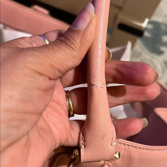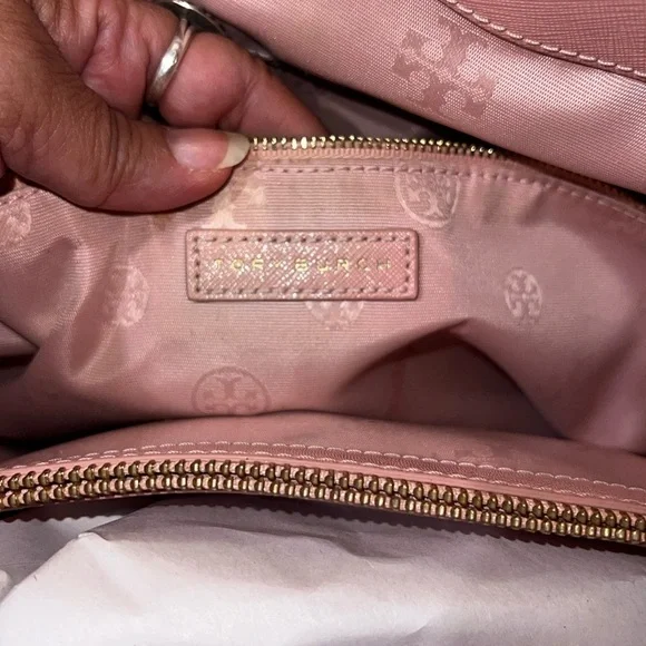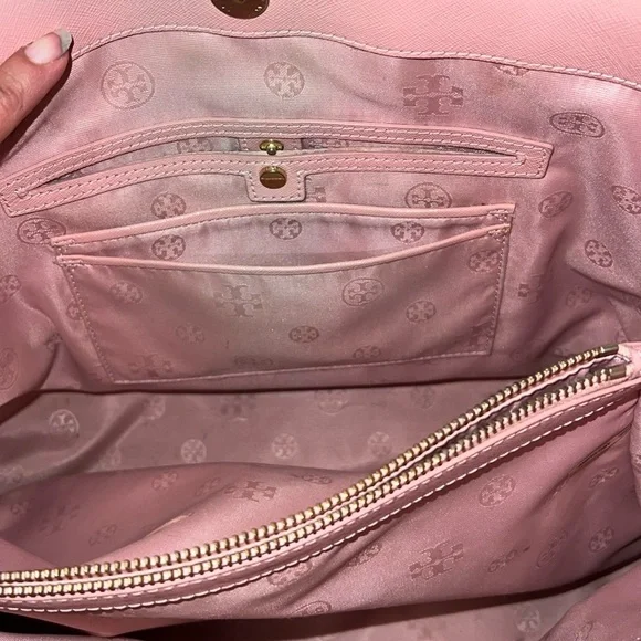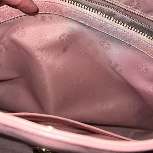 Sumptuous saffiano leather in a roomy top-handle carryall with polished logo hardware.Double top handles, 7¾" drop Top snap closure Protective metal feet Center zip compartment One inside zip pocket Two inside open pockets One inner mirror 15"W X 12"H X 5"D ImportedNamed for Tory’s parents — Buddy and Reva Robinson — it’s a modern classic. The epitome of understated chic, the Robinson Tote is made of the highest-quality, scratch-resistant patent leather. The roomy shape features plenty of pockets and compartments for organizing essentials — great for work or weekend.Purse is in good preowned condition. It does show signs of wear on the sides of the purse where it naturally folds inside there is a few stains. Nothing major still a very good bag for the price. Please ask questions before purchasing no international shipping.