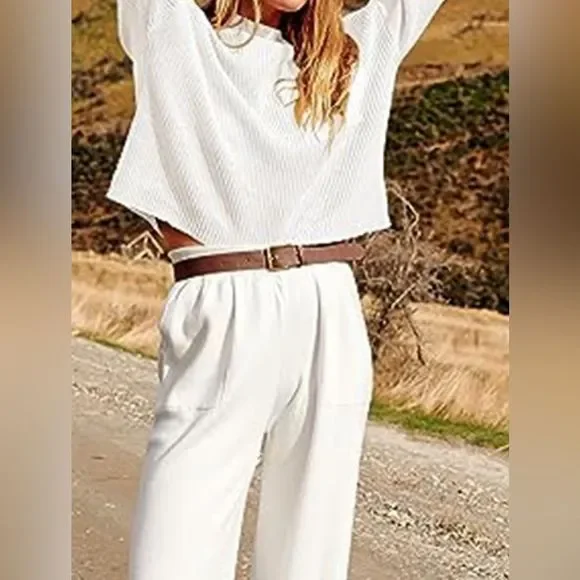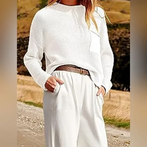White Comfy Fall Knit Top and Joggers SetPlease allow 7-10 business days to ship.Features: PocketedNumber of pieces: Two-pieceStretch: Highly stretchyMaterial composition: 100% polyesterCare instructions: Machine wash cold. Tumble dry low.ImportedProduct measurements:Top:S: bust 20.5 in, sleeve length 17.7 in, length 19.3 inM: bust 21.5 in, sleeve length 18.1 in, length 19.7 inL: bust 22.6 in, sleeve length 18.5 in, length 20.1 inXL: bust 23.8 in, sleeve length 18.9 in, length 20.5 in2XL: bust 25.1 in, sleeve length 19.3 in, length 20.9 inBottoms:S: waist 25.6 in, hip 20.9 in, length 37 inM: waist 26.8 in, hip 21.7 in, length 37.6 inL: waist 28 in, hip 22.5 in, length 38.2 inXL: waist 35.2 in, hip 23.2 in, length 38.8 in2XL: waist 36 in, hip 24 in, length 39.4 inKnit Top and Joggers Set