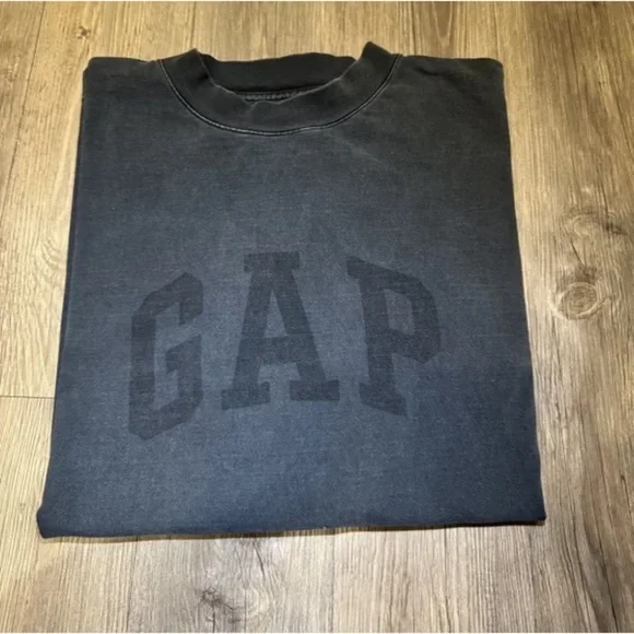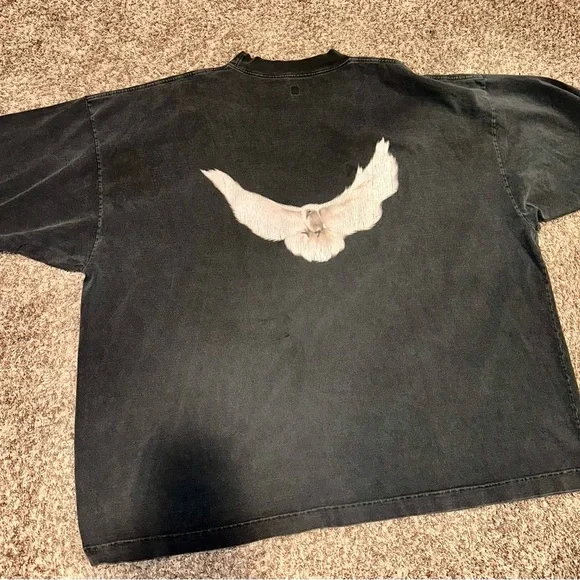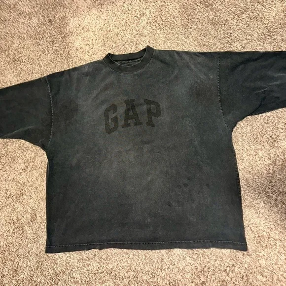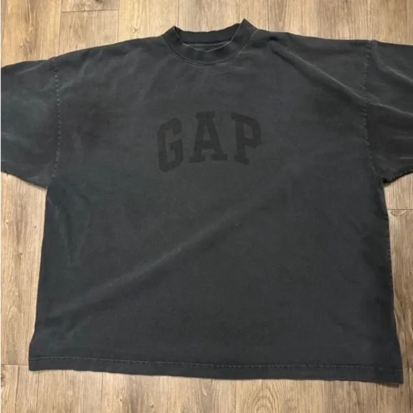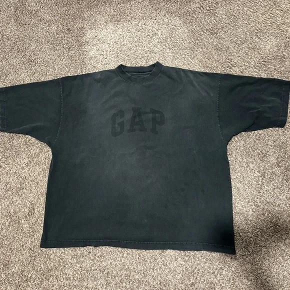Great piece from the short lived Yeezy x GAP x Balenciaga collab. Printed on a uniquely cut heavyweight t shirt, features pre-distressed printing and a washed look. Provides boxy fit, with dropped shoulders.This item has an oversized fit and is custom-dyed. Each piece has a slight variation in color, tone, and pattern. The corners feature a few distressed holes, not sign of wear.